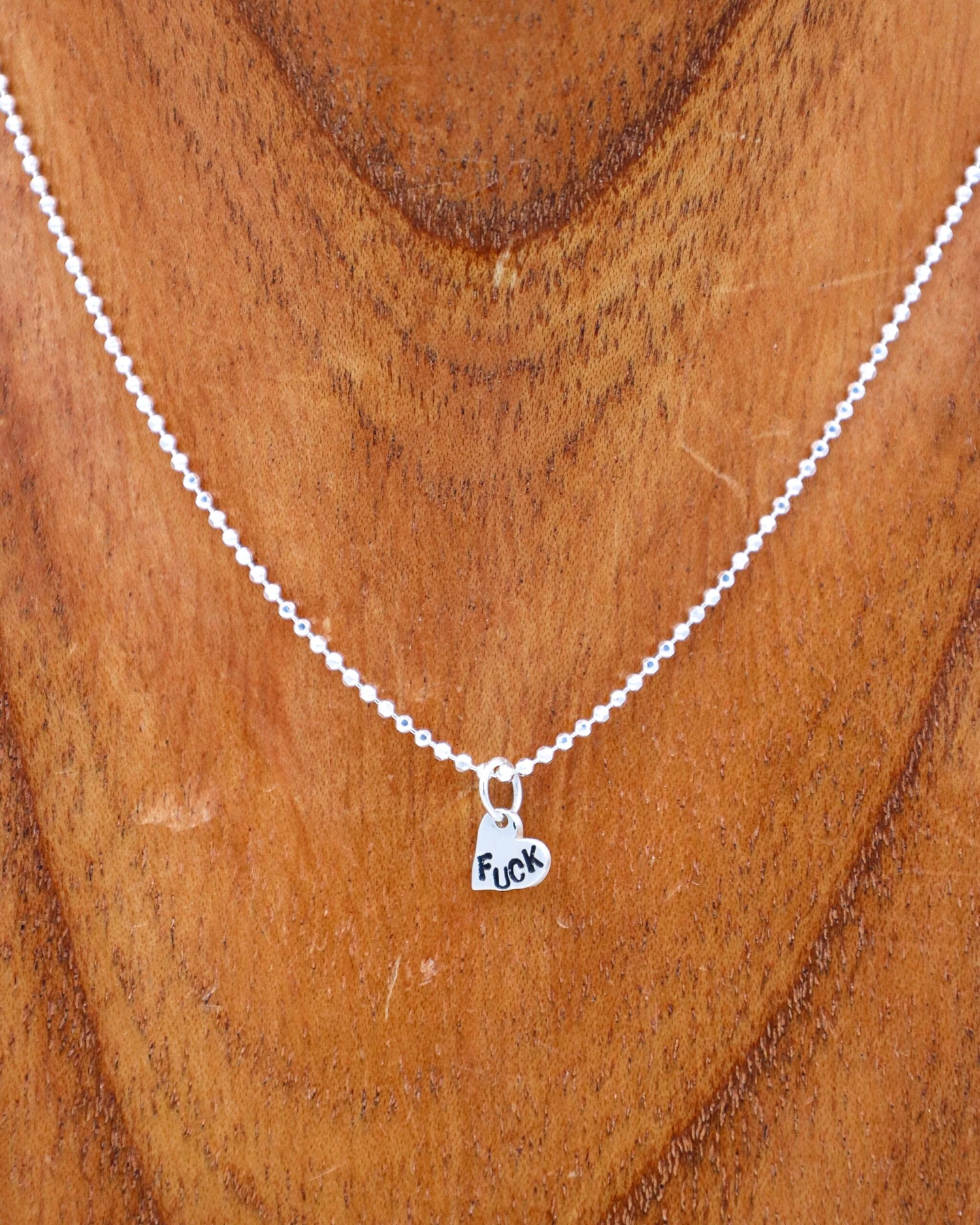 This subtly hilarious necklace is sure to become a staple in your jewelry collection! Handmade by Texas native Margaret Sullivan, this necklace features a tiny Sterling Silver heart with “Fuck” engraved on it and a silver beaded chain with a simple clasp closure. This adorable necklace can be worn on its own everyday or stacked with other Margaret Sullivan necklaces to complete any night-out look.