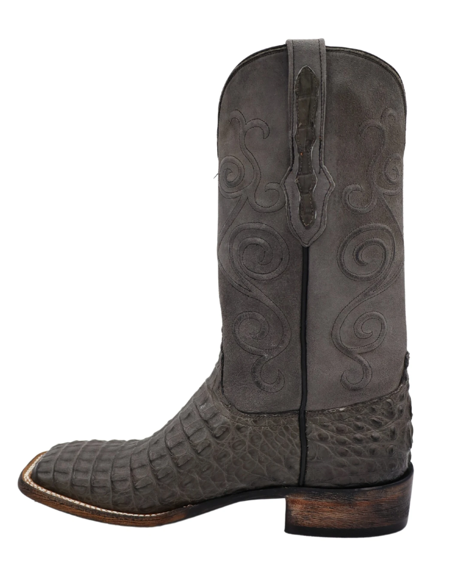 Find the luxury you deserve with the all-new Black Jack Caiman Dark Grey Boot. Featuring a square toe, caiman belly upper, and curly embroidered shaft detail, this top of the line cowboy boot is made to turn heads with its sophisticated black and grey hues. Dare to make a statement and experience the first-class craftsmanship of the leather sole!