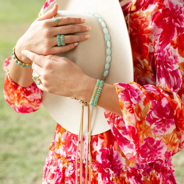 Sweet and easy, the North Star Ring is a beautiful way to add a pop to every outfit. This ring features an oblong turquoise stone set into 18K gold-plated brass. Accented by small studs for beautiful texture, this hypoallergenic ring is a playful look. An open back allows the wearer to size this ring to their preference and wear on whichever finger they prefer. Team the North Star Ring with the Starburst Cuff or Starburst Stud Earrings for a polished styling.