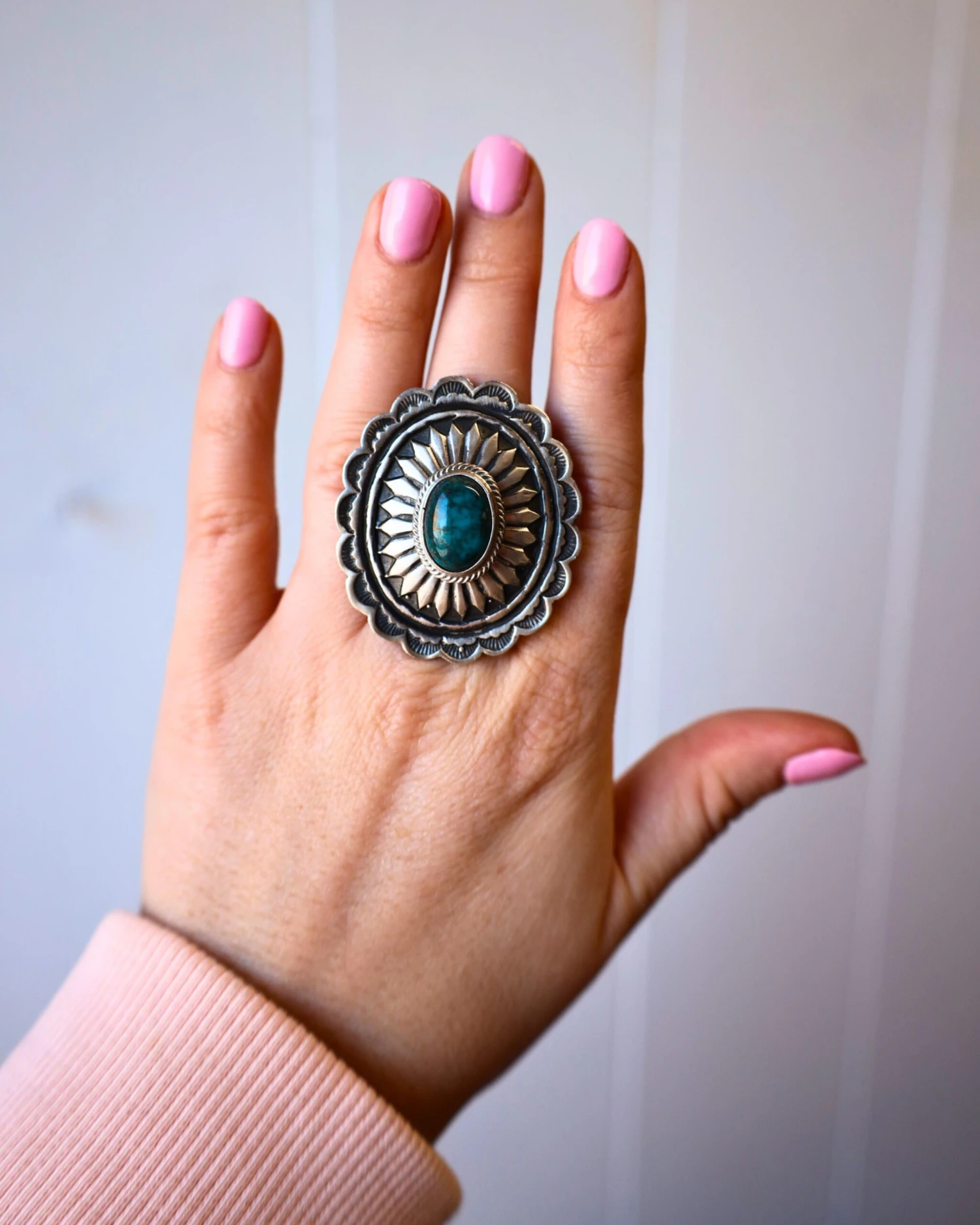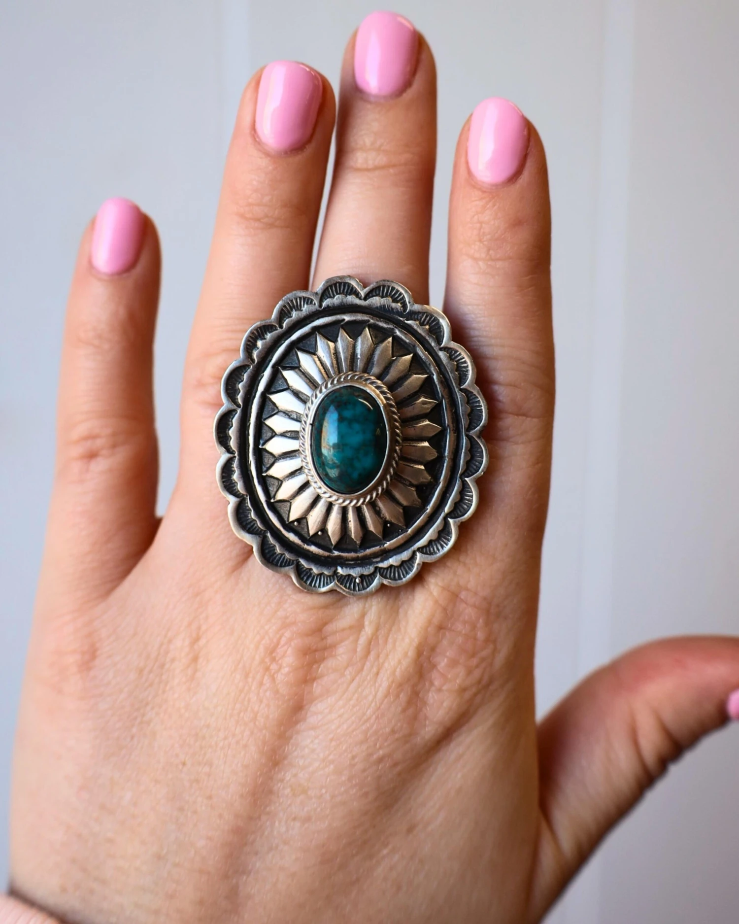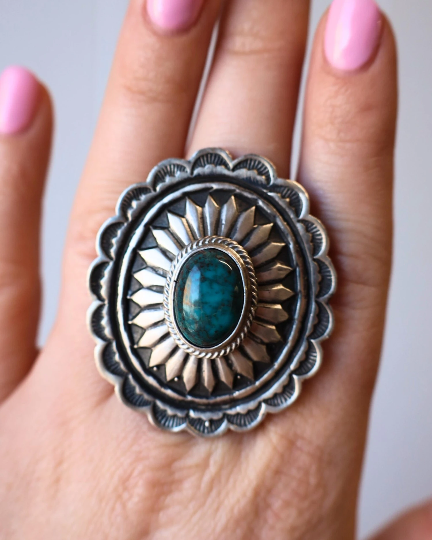 Crafted from high-quality sterling silver, this ring features a gorgeous dark turquoise gemstone that is sure to catch the eye. The intricate concho design adds a touch of Western flair, making it the perfect accessory for any rodeo or country concert.