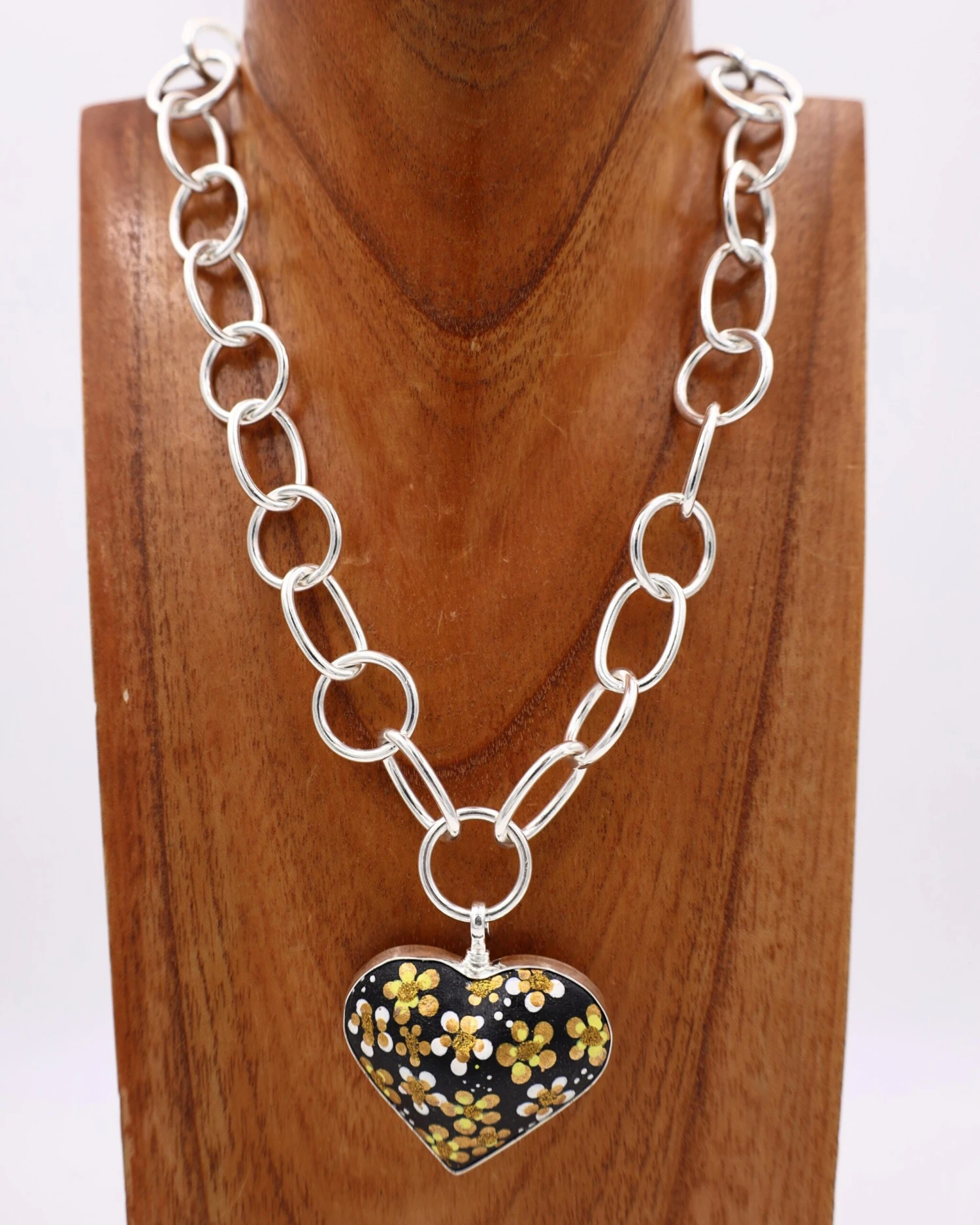 Tell your story with Coreen Cordova’s Black Heart Gold Flower Pendant. With beautiful tiny gold floral design over a solid black background on a 3D heart, this charm can be worn solo or on a chunky chain along with your other favorite pendants.