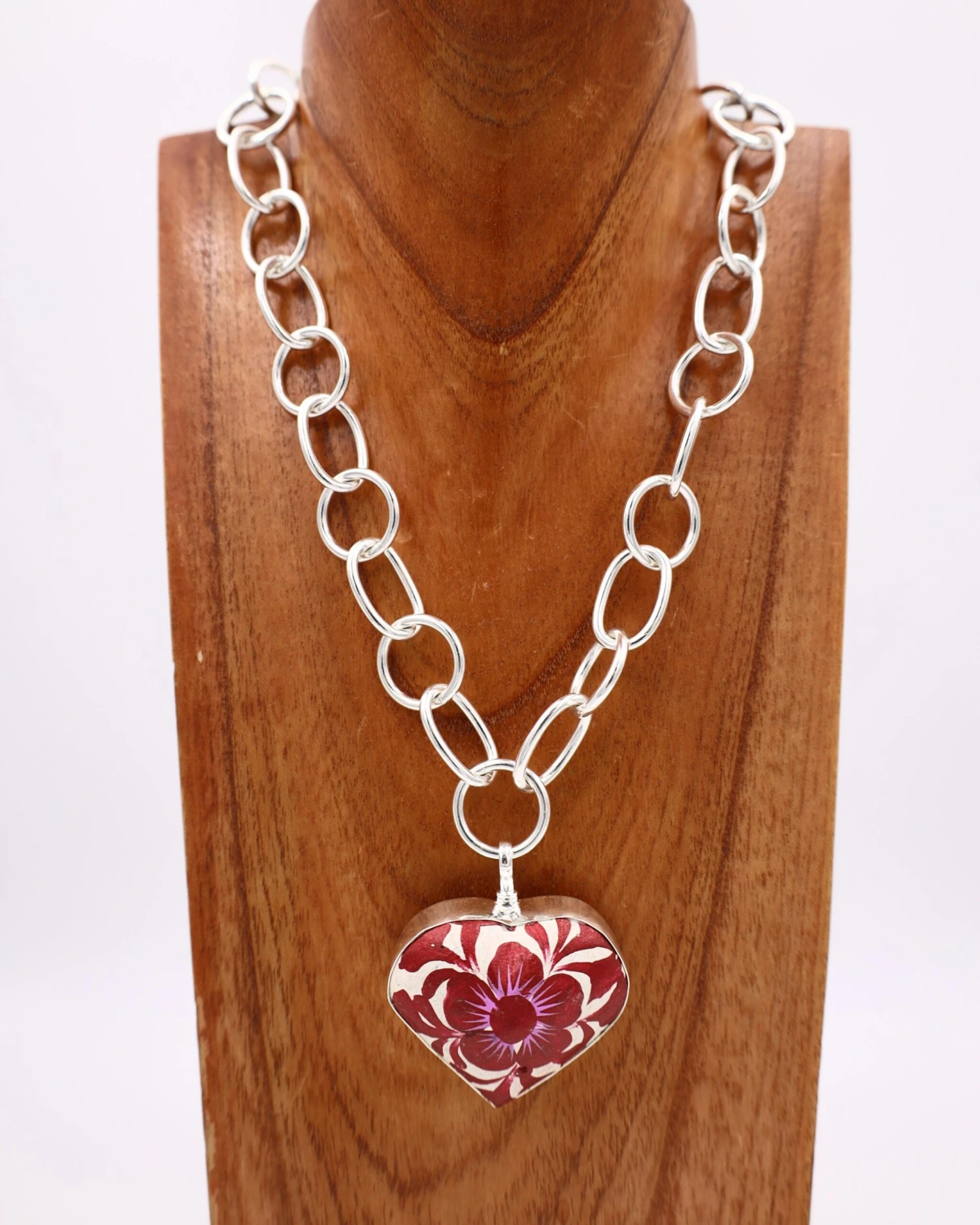 Tell your story with Coreen Cordova’s White Heart Red Flower Pendant. With intricate red floral design over a crisp, white background on a 3D heart, this charm can be worn solo or on a chunky chain along with your other favorite pendants.