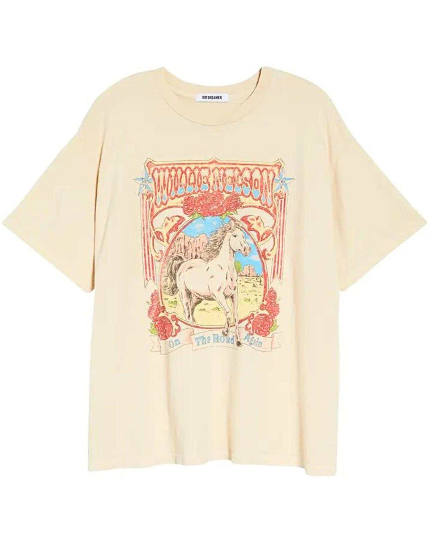 Find your happy place on the road again in this soft cotton tee with vintage-look graphics.