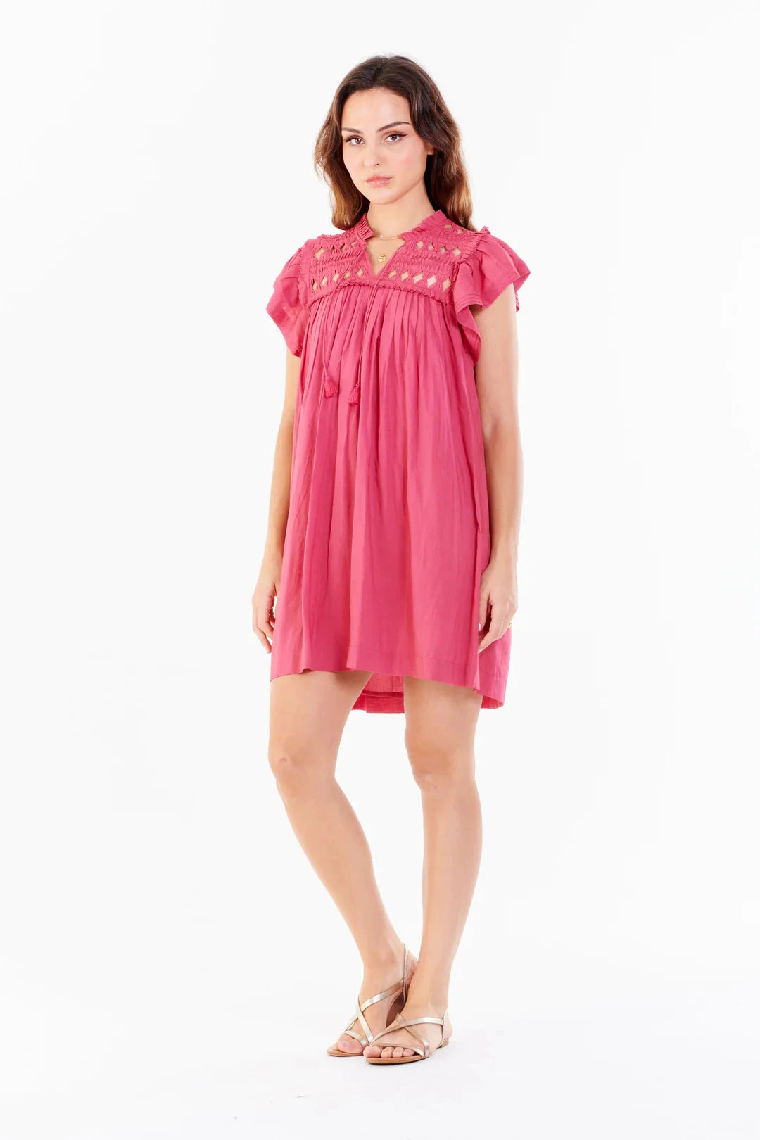 Knotted embroidery midi dress with side pockets, open slit front with self-ties, petal sleeve finished with pleating & ruffle details. Eternity love! Definition of graceful style & artisan embroidery! The masterpiece to treasure… Solid color woven on relaxed fit.