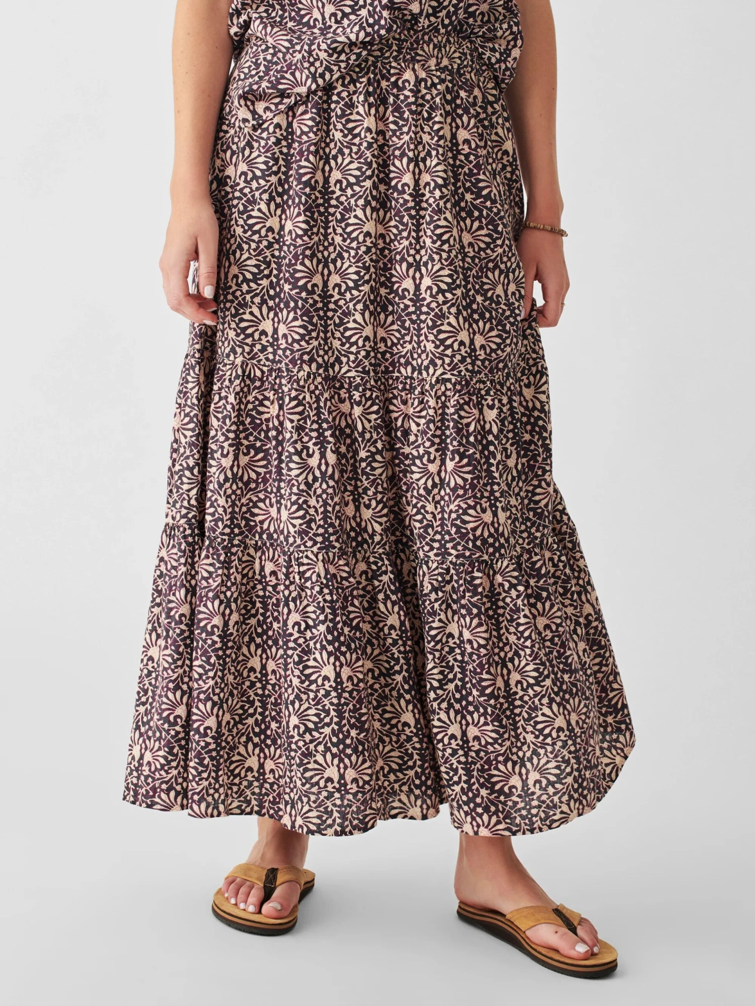 Our beautifully draped maxi skirt is made from breezy linen and constructed with an easy, pull-on elastic waist. Subtle tiers add volume for a floaty, romantic look while keeping you airy and cool. It’s a no-fuss, pack-and-go solution to looking instantly put-together.