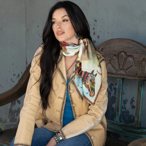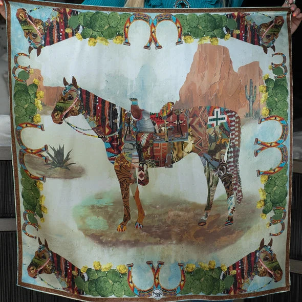 The Haute Horse comes in our Shorty sizes and is 100% Satin Silk. Designed by my friend Amy Moorhouse, this one is full of detail. You might want to grab a coffee and sit down with this scarf for an hour or so to see what you can find hidden in this collage design – using pieces of jewelry, rugs, tapestry and collectibles.