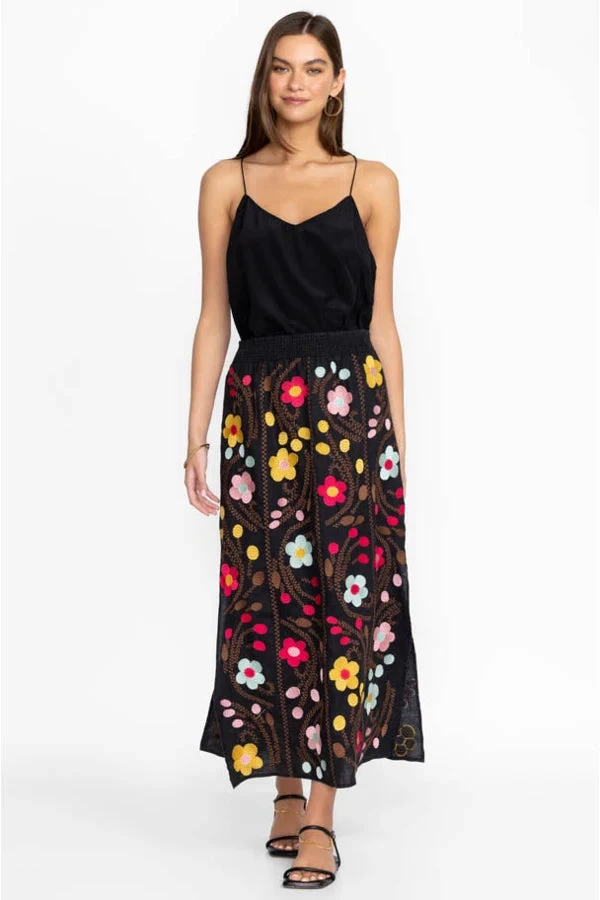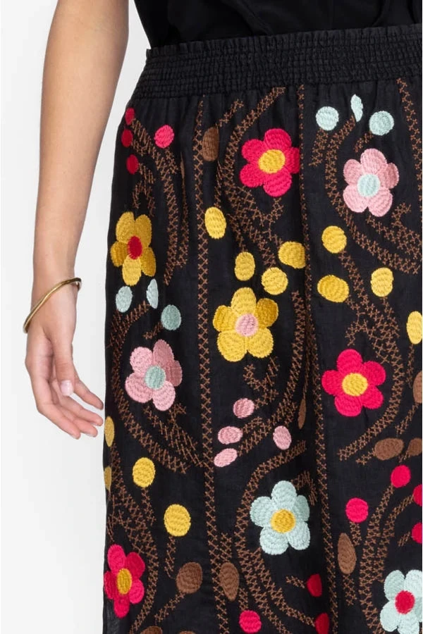 Designed from pure linen, this Joni High Slit Linen Skirt is perfect for a day spent dining under soft rays of sunshine. Crafted in jet black, this skirt boasts a smocked waist for a comfortable fit, a high slit for easy movement, and a happy floral placement embroidery in rich shades. For the day, style with a plain tee and flats, and in the evening, opt for a silk blouse and heels. Product Details: • 100% Linen • Placement Embroidery • Smocked Waist • Model Height: 5’11” • Model is wearing a size Small • Measurements for Size Medium: Waist- 22″, Length- 39″ • Care instructions: Machine wash cold. Non chlorine bleach when needed. Tumble dry low. Warm iron.