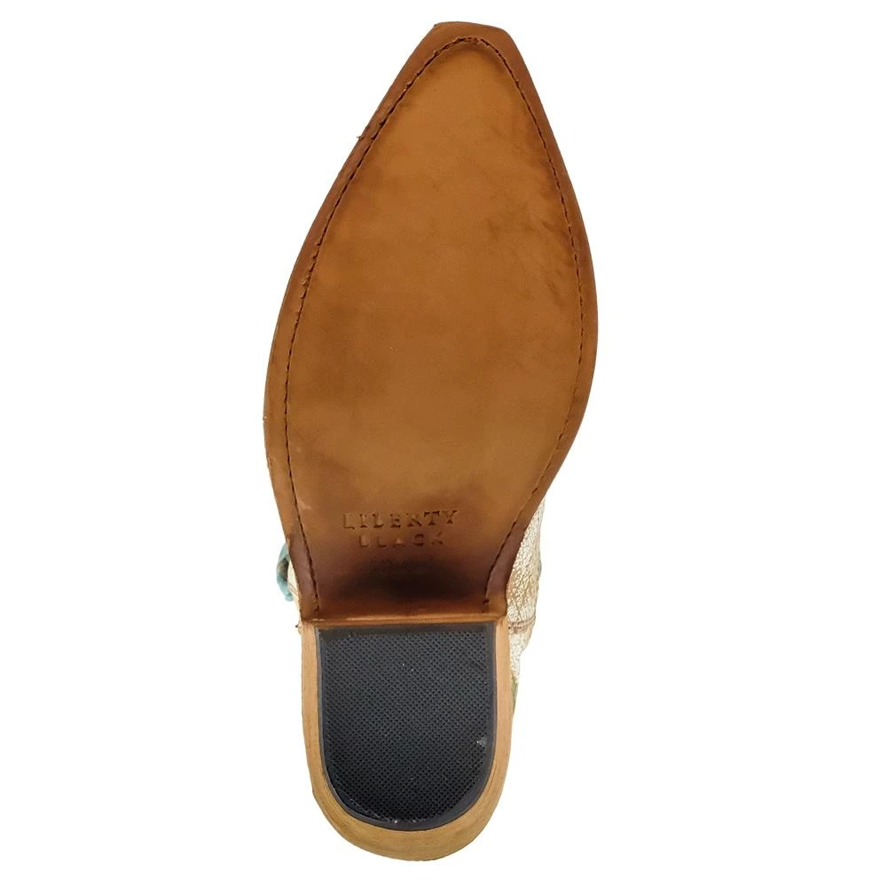 They’re the kind of cowgirl boots that would make Carrie Bradshaw say, “Hello Lovers!” Check out this darling design by Liberty Black, made with distressed tan and white leather, accented with turquoise and green floral embroidery. She’ll hit mid calf, a great boot height for any time of year, and we’re loving the braided details at the collar. They’re fun, feminine, flirty – the perfect pair of western boots… cowgirl couture if you will!