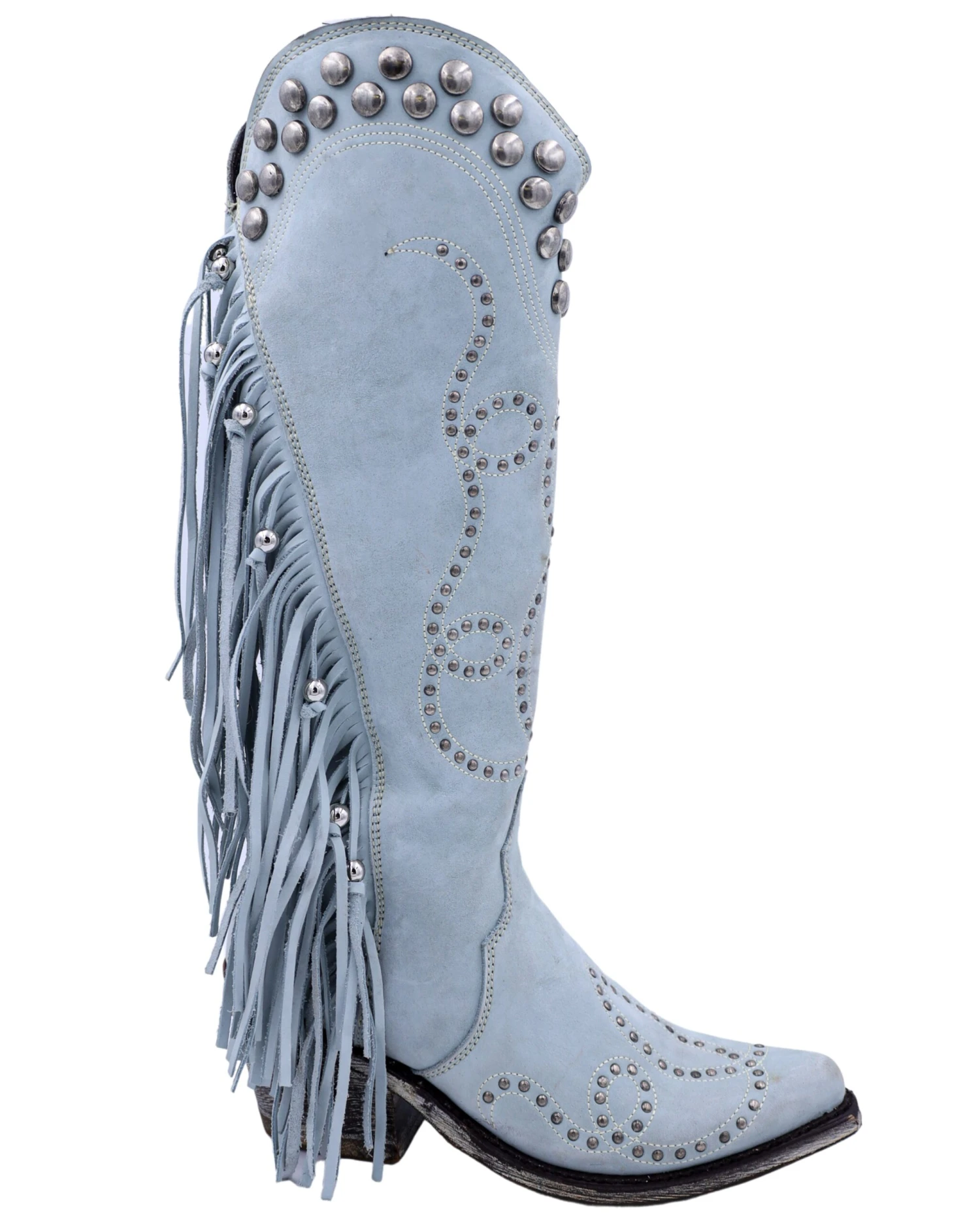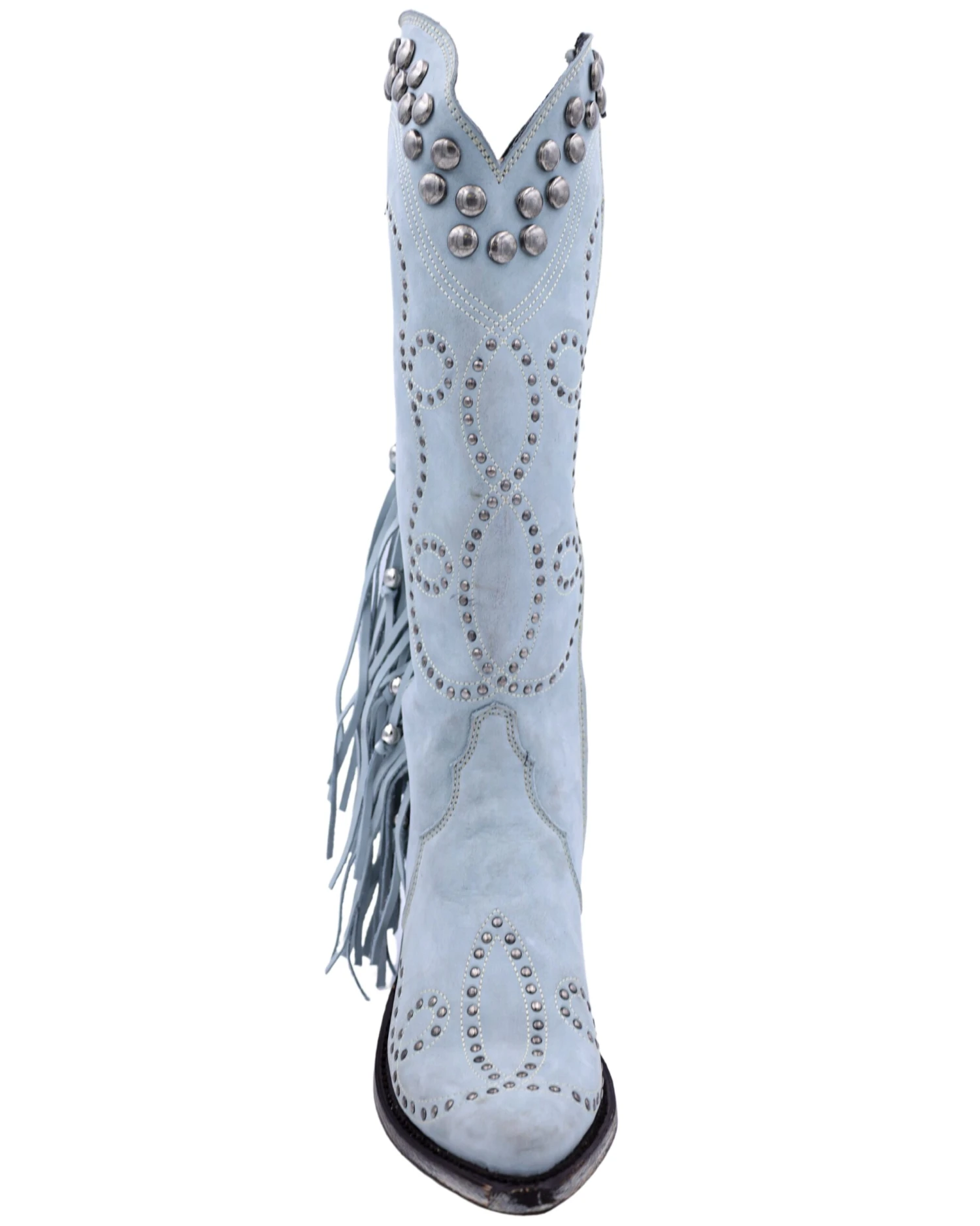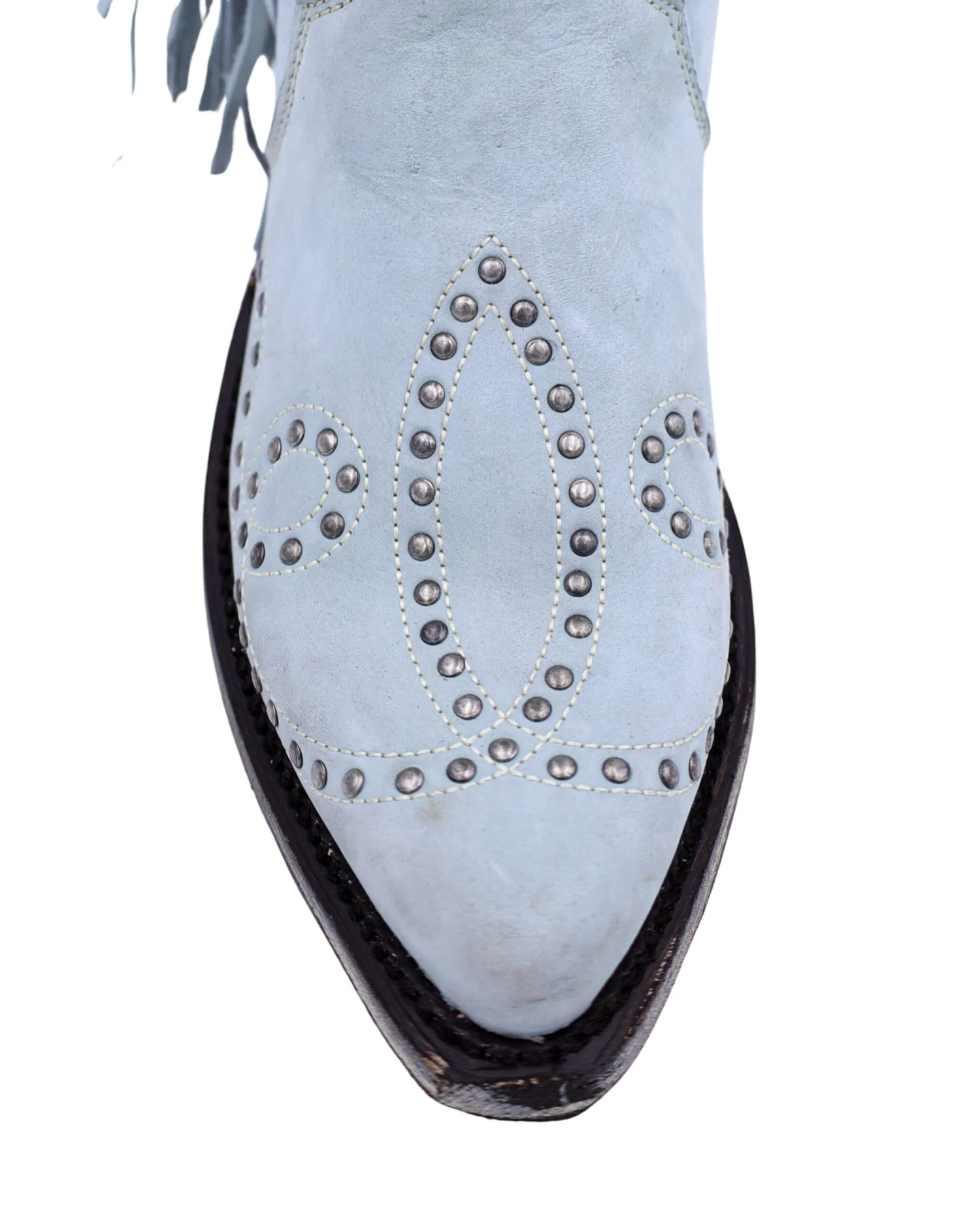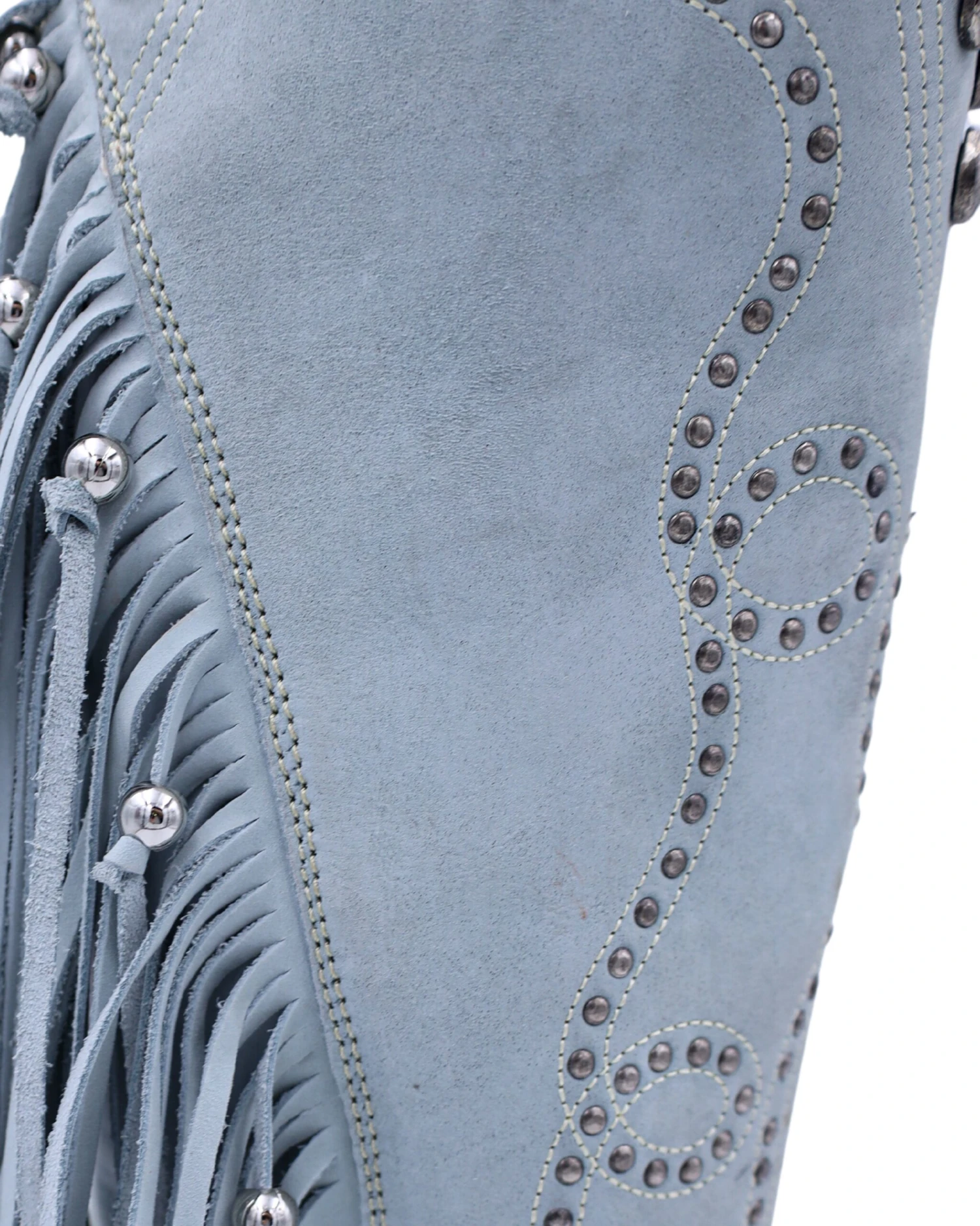 The neutral gray (small hints of light blue) leather on these Liberty Black Boots is luscious and lovely, all Fringe Benefits included! It’s all perfection – from the unique color – around to the studded stitch patterns throughout – and all the way down the cascading fringe – every inch of this sassy silhouette is bringing sexy back! Get flirty in these fun loving cowboy boots!