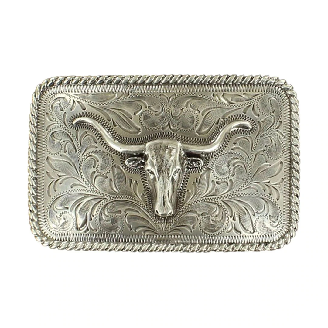 This rectangle shaped buckle designed by M & F Western Products has a longhorn with beautiful western design in background. There is a twisted rope edge border.