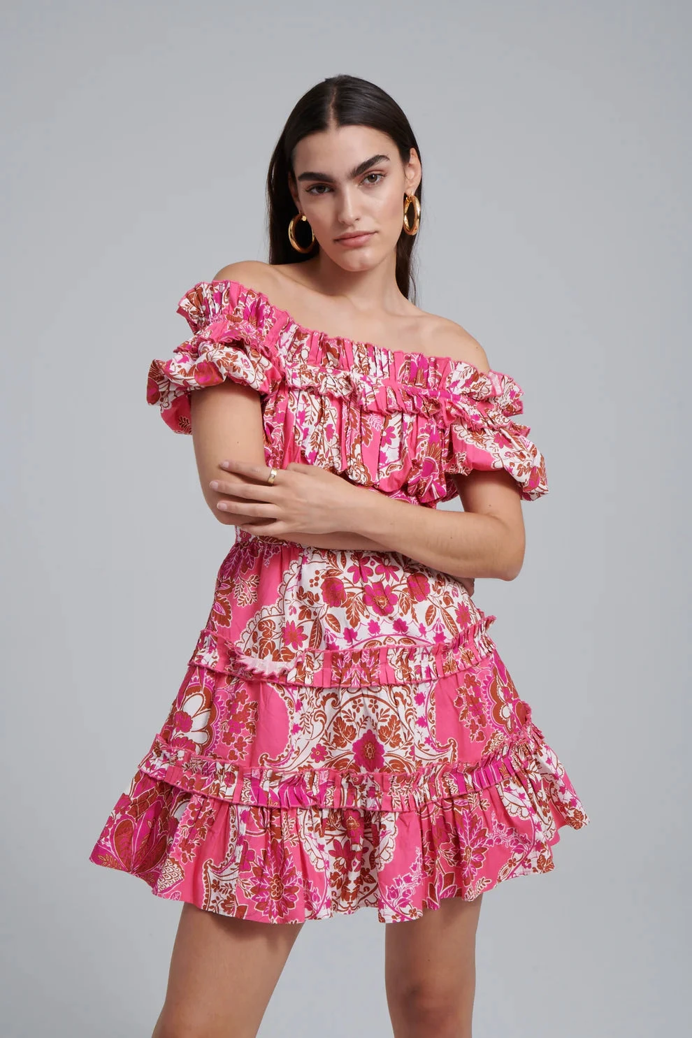 Off the shoulder stunner in the Clementine Pink Print. Features ruffle details along the tiers and slight smocking on the back for an easy fit. 100% cotton.
