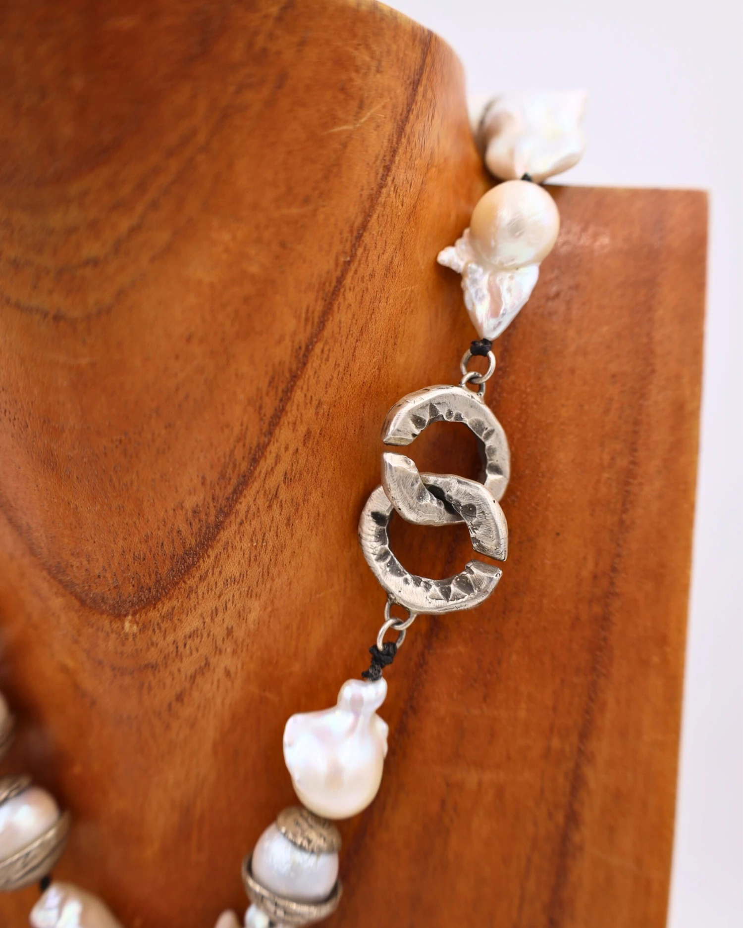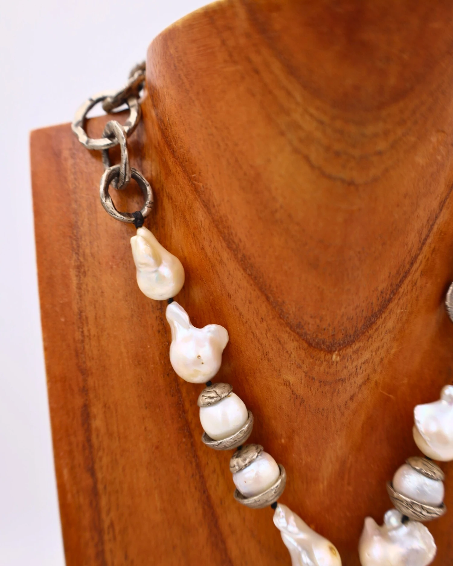 Introducing the Love Tokens Baroque, Chief, Arrow and Kingman Turquoise Necklace, a stunning and unique piece of jewelry that’s sure to turn heads. This necklace features an abstract baroque pearl chain that’s connected to chunky chains where a sterling silver Indian chief head, arrow with a turquoise round on it, and a large turquoise slab hang.