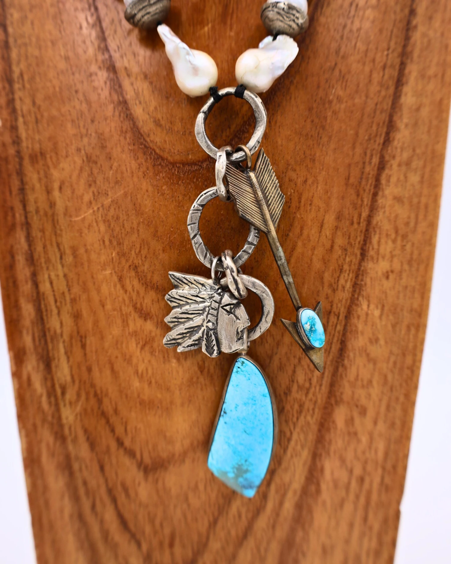 The abstract baroque pearl chain adds a touch of elegance and sophistication to the necklace, while the chunky chains provide a bold and striking contrast. The sterling silver Indian chief head pendant is expertly crafted, with intricate detailing that showcases the exceptional workmanship of Love Tokens. The arrow pendant with a turquoise round on it adds a touch of color and vibrancy to the piece, while the large turquoise slab pendant creates a bold and eye-catching design.