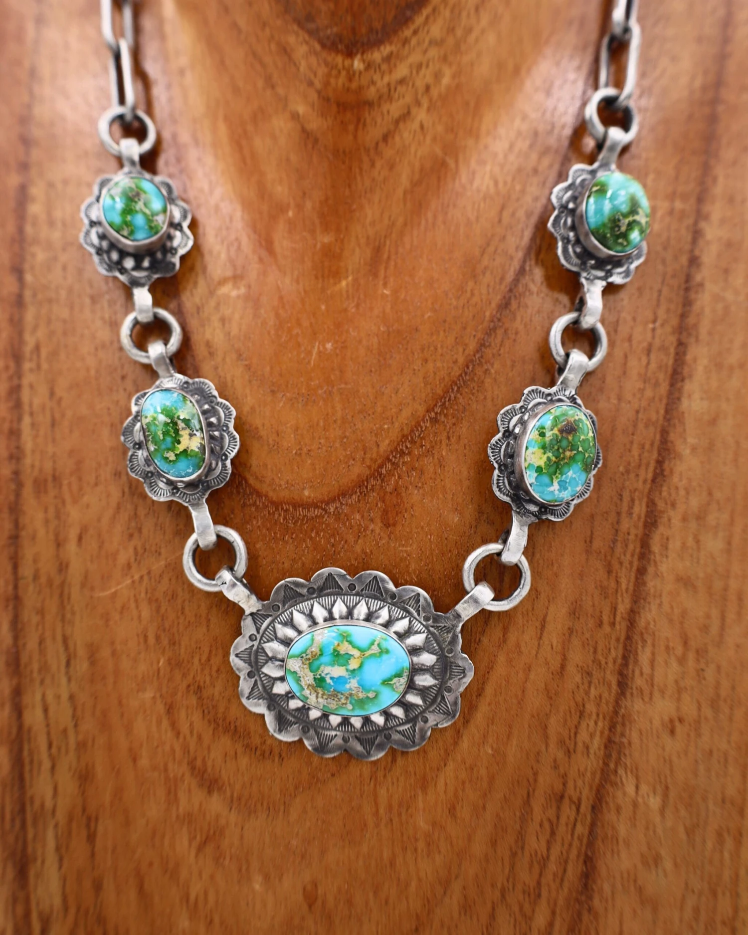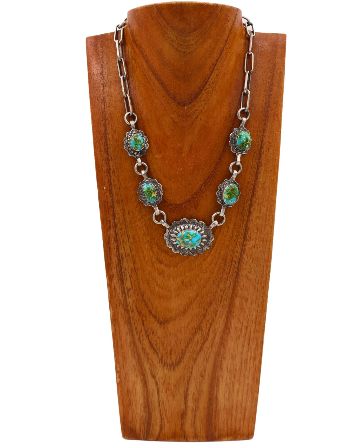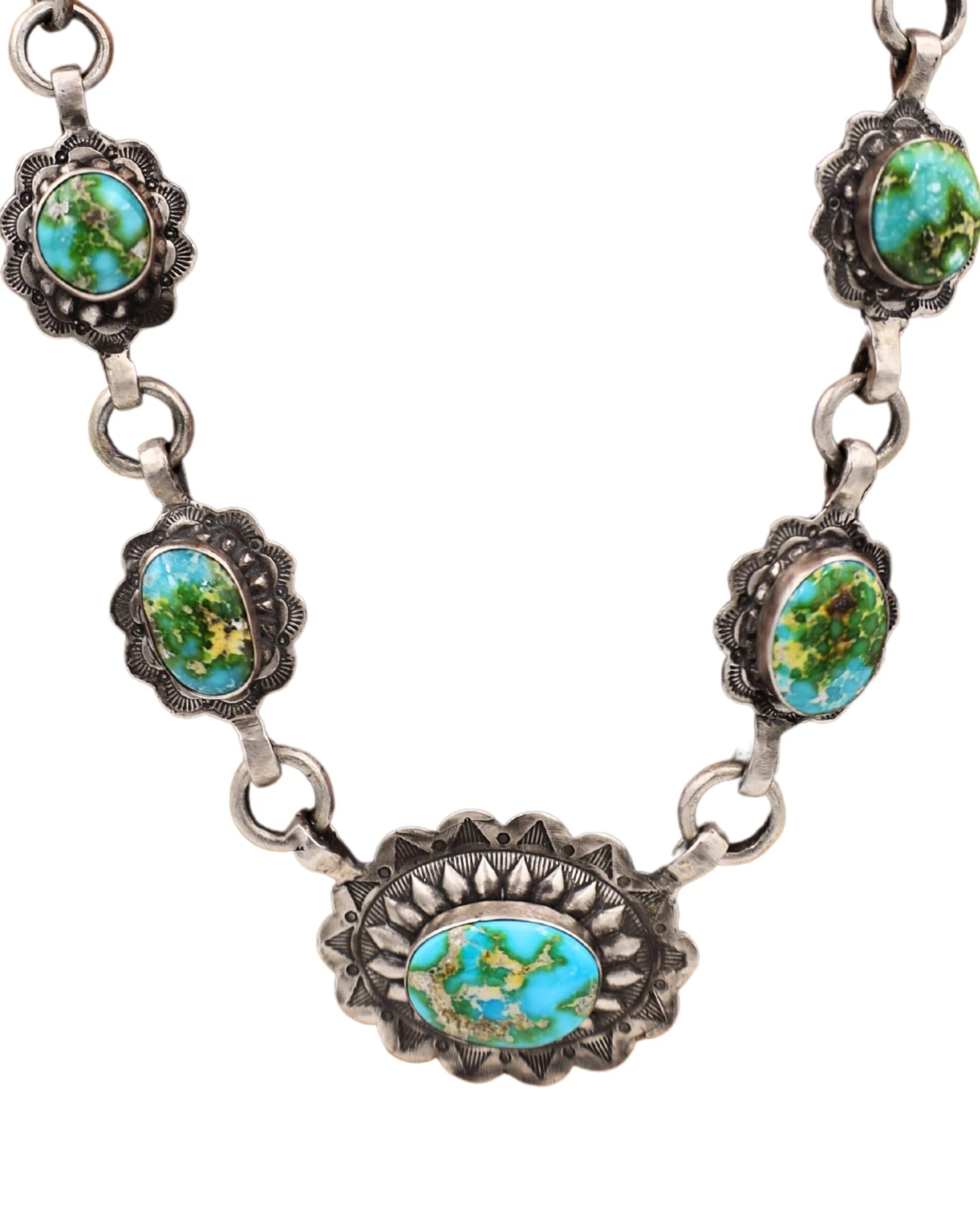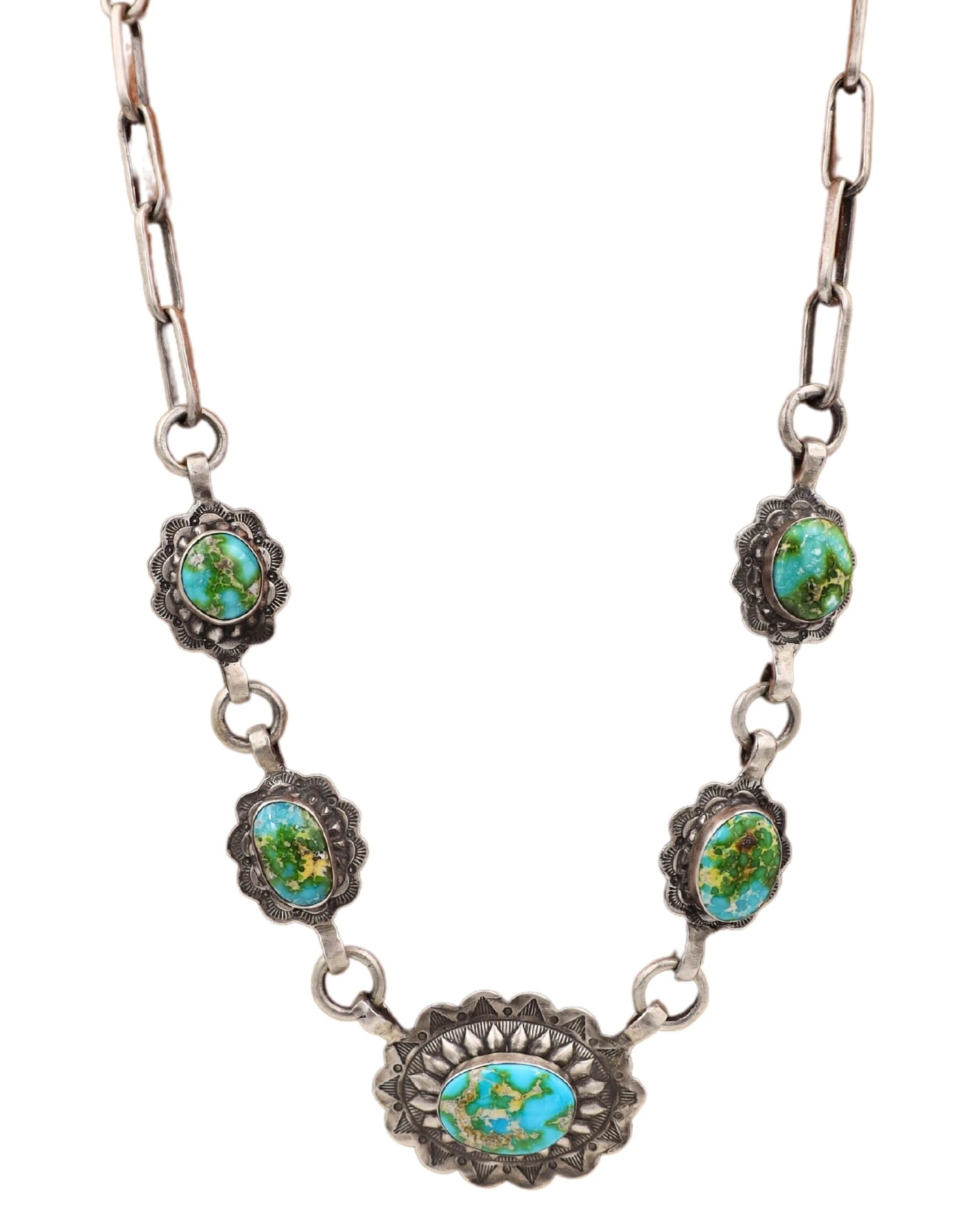 Unleash your inner cowgirl with these gorgeous Love Tokens Concho Necklace! Crafted from sterling silver and hand-set with turquoise stones, these captivating conchos will add a touch of western flair to your look. What are you waiting for? Add a bold dose of style to your wardrobe today!