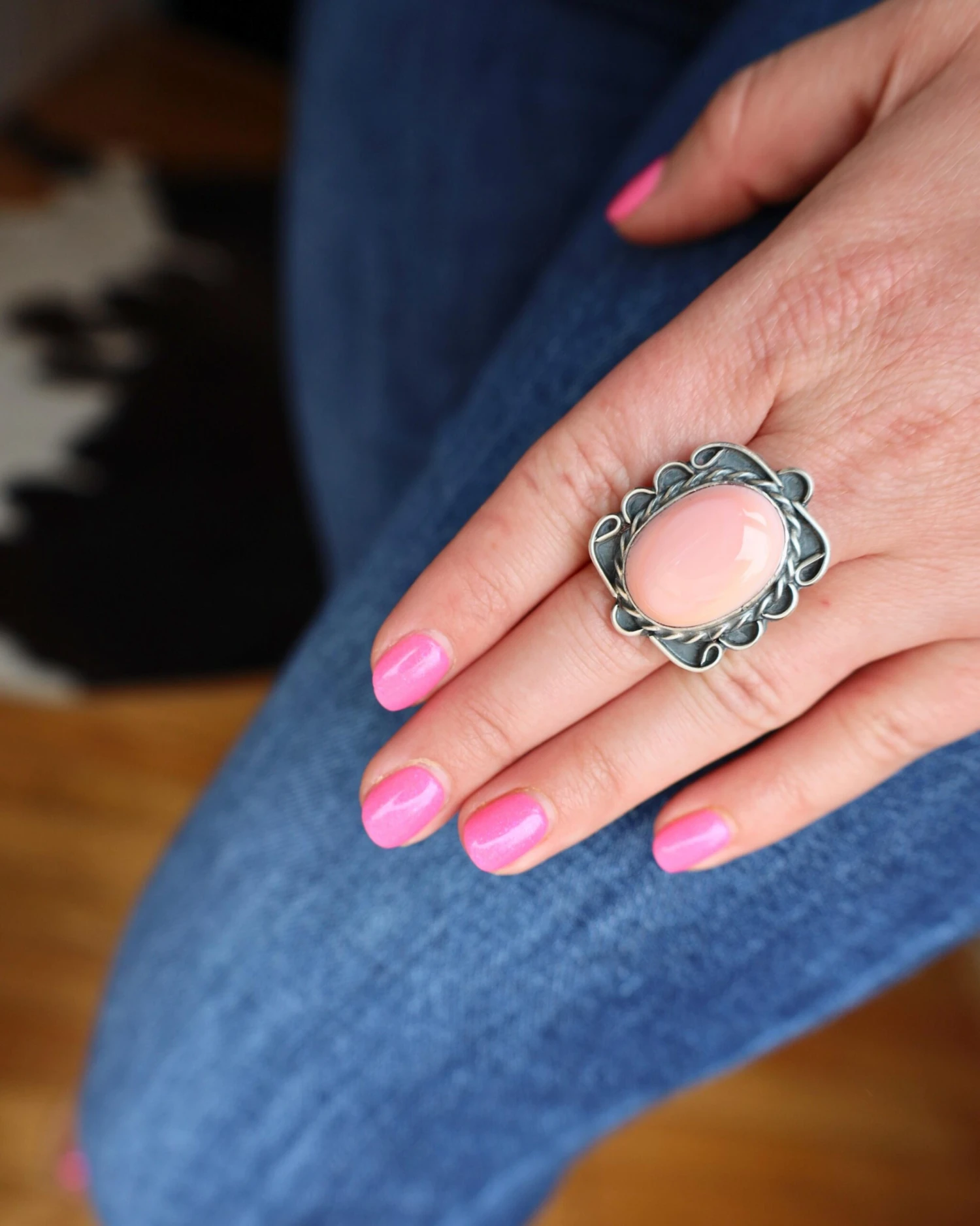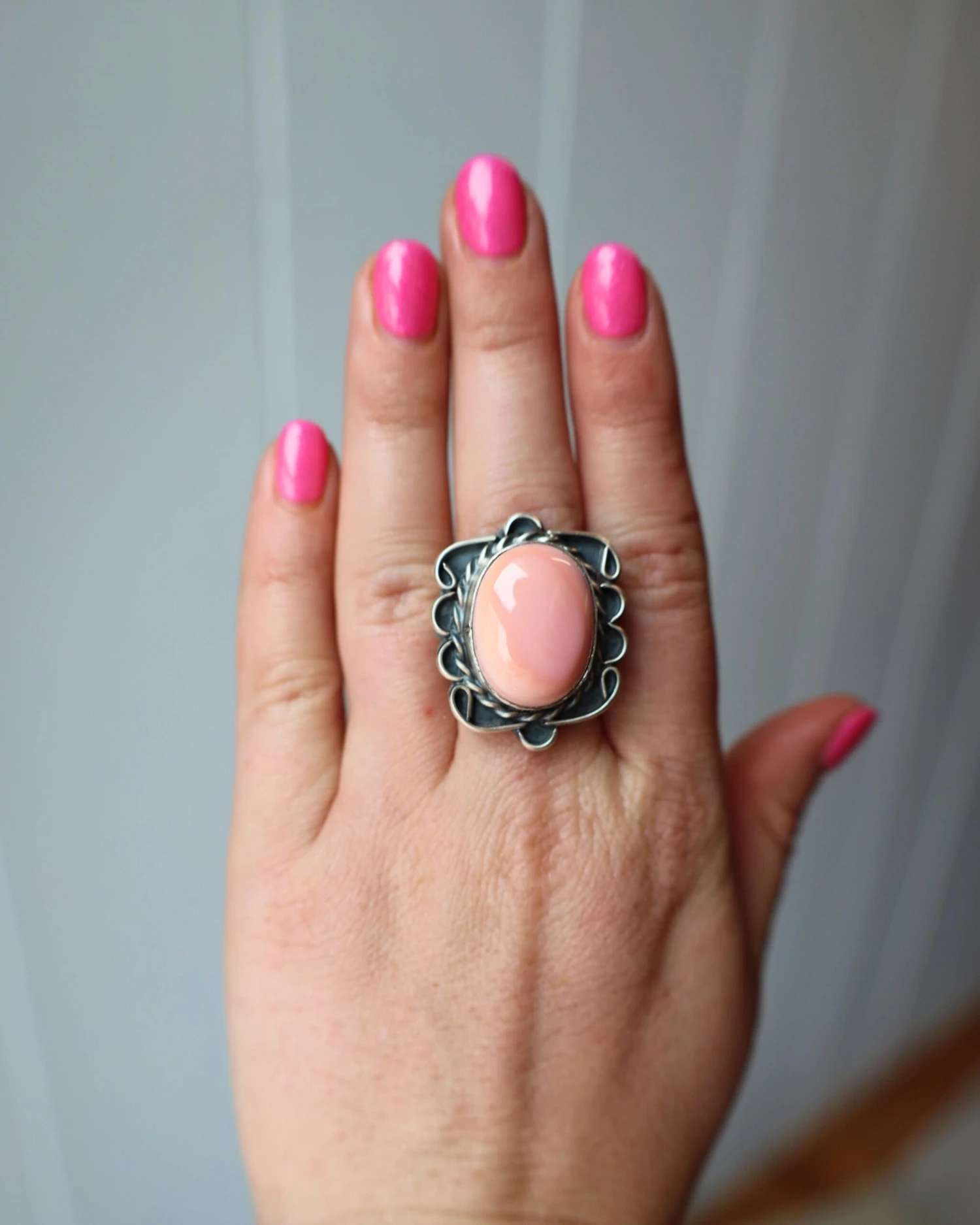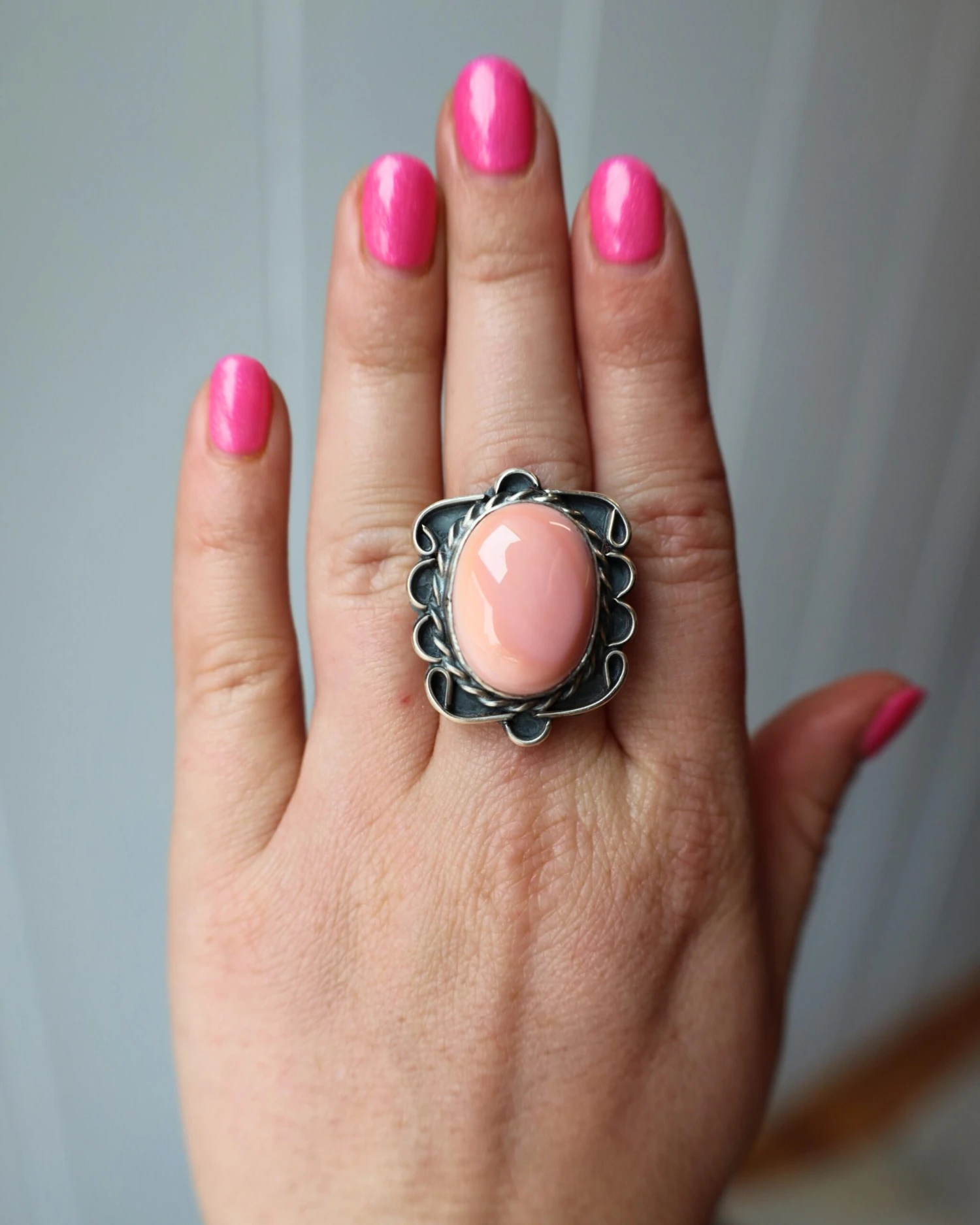 Crafted from high-quality sterling silver, this ring is both durable and stylish. The medium pink conch shell oval at the center adds a touch of elegance and charm to the piece, while the sterling silver ornate detail border around the center oval stone creates a beautiful contrast and completes the Western-inspired look.