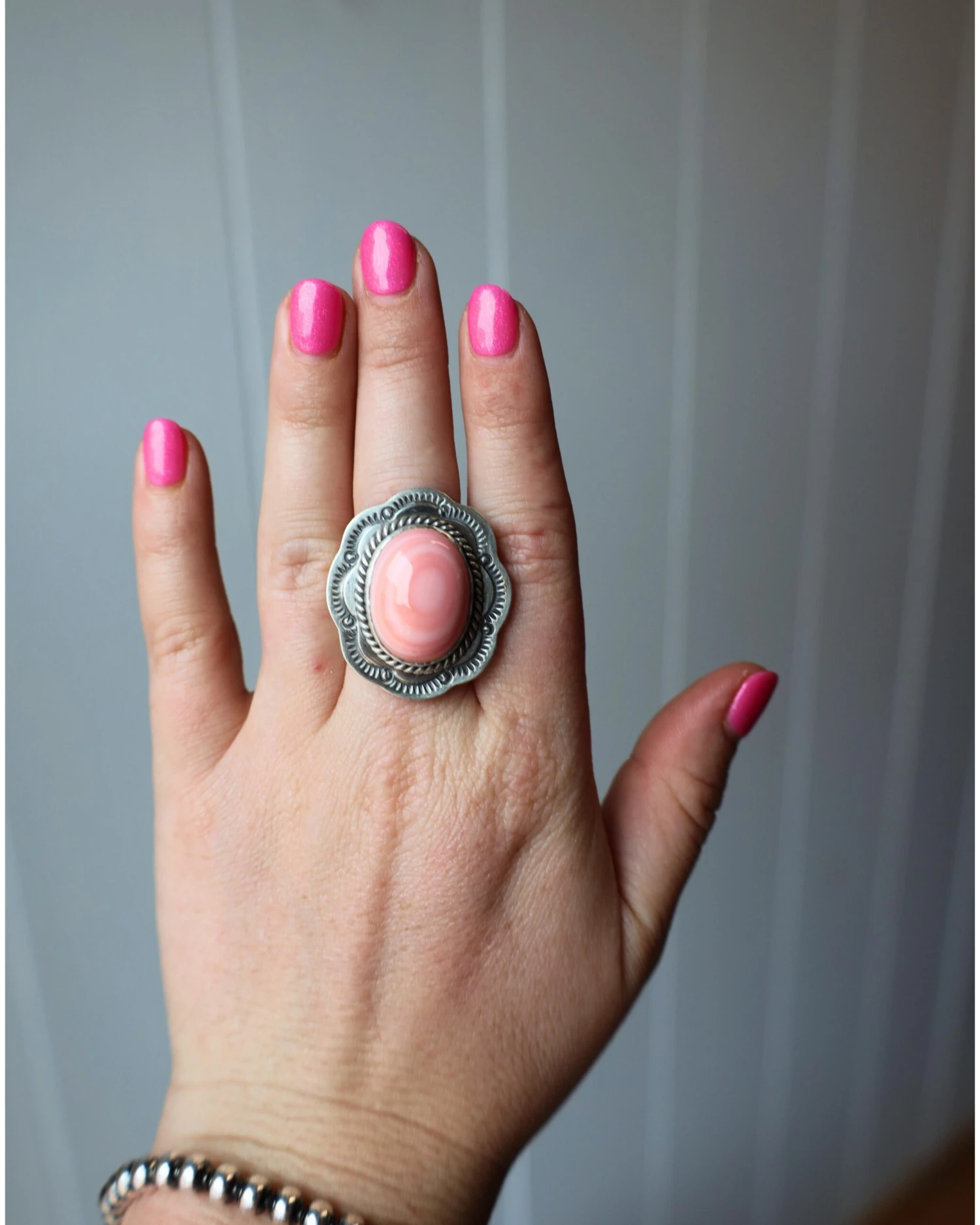 Crafted from high-quality sterling silver, this ring is both durable and stylish. The medium pink conch shell oval on the face of the ring adds a touch of elegance and charm to the piece, while the sterling silver scallop boarder creates a beautiful contrast and completes the Western-inspired look.