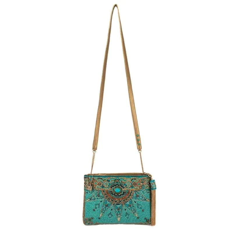 The natural Turquoise gemstones that represent wisdom, tranquility, and protection highlight this exquisite beaded crossbody handbag.