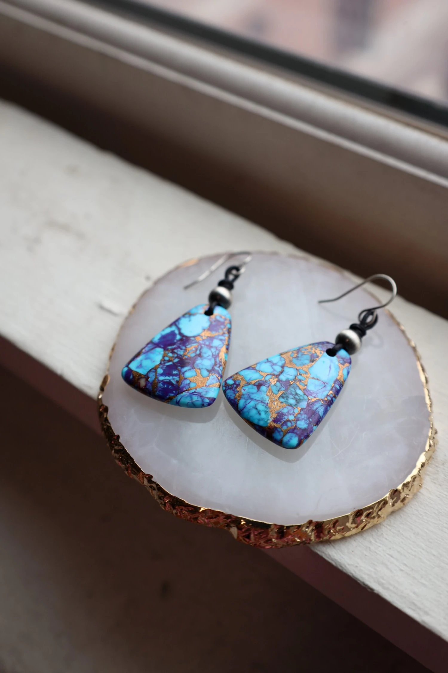 Make a statement with this unique, Peyote Bird Purple Mojave Earring. Featuring an unusual stone, this one-of-a-kind piece adds an eye-catching cool tone to your look. With a larger size and statement design, you’ll be turning heads everywhere you go! So why wait? Get yours today and stand out from the crowd!