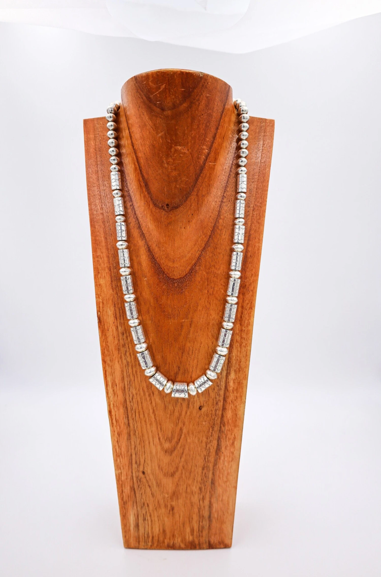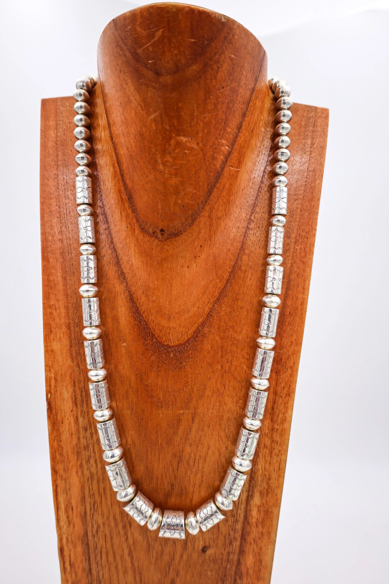 This beautiful and chic Peyote Bird Sterling Silver Stamped Tubes Saucers Necklace is the perfect way to add an elegant touch of style to any outfit. Handcrafted from high-end sterling silver, the unique south western design on each bead adds a unique and inspiring flair. Show off your originality and sophistication with this eye-catching necklace!