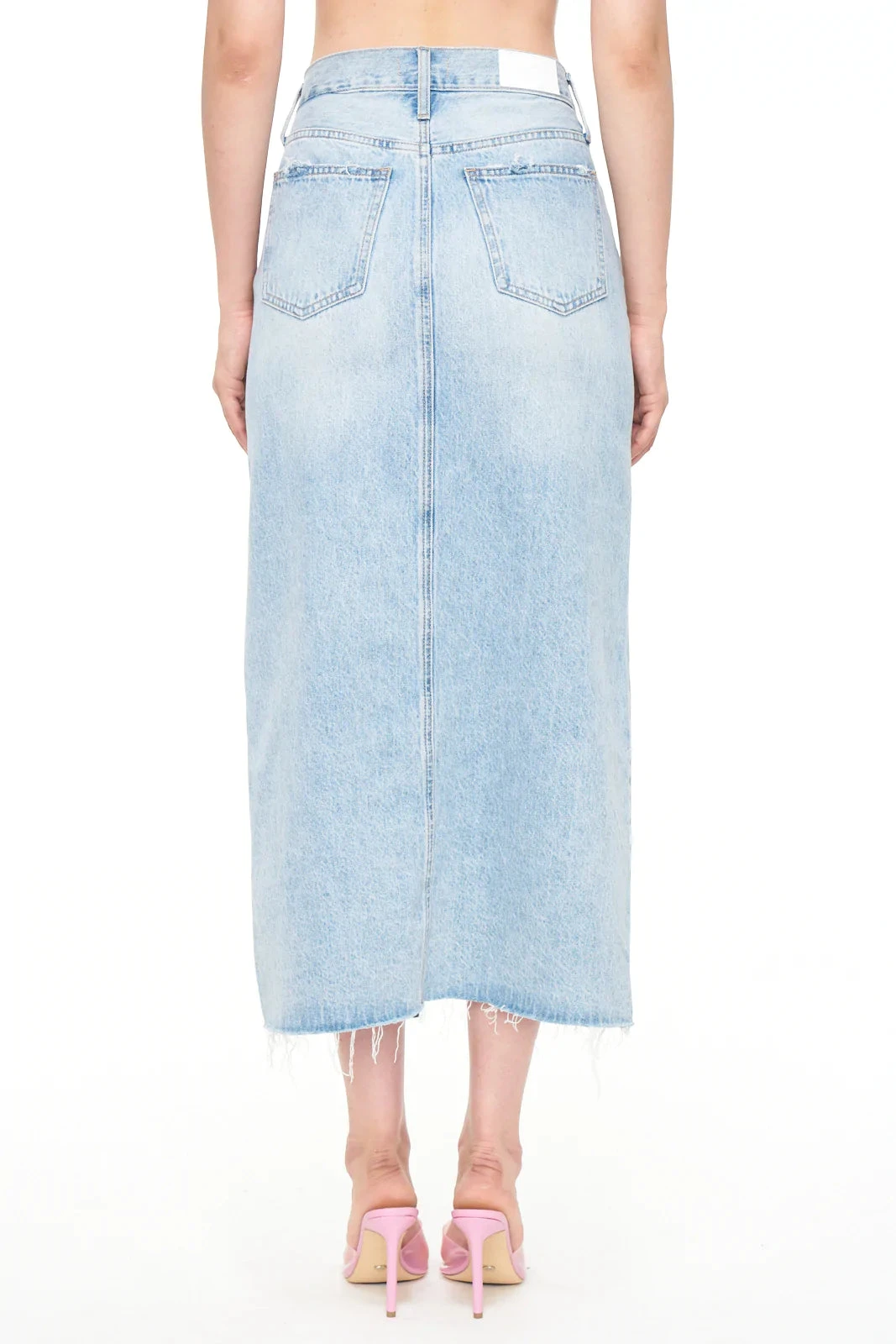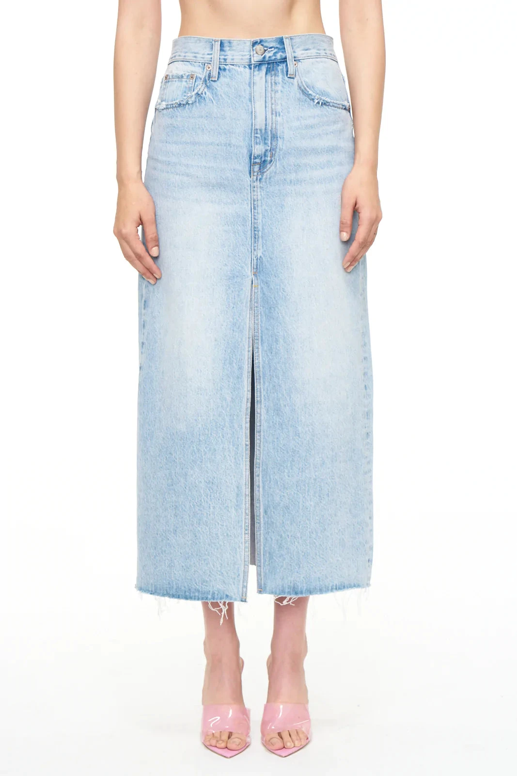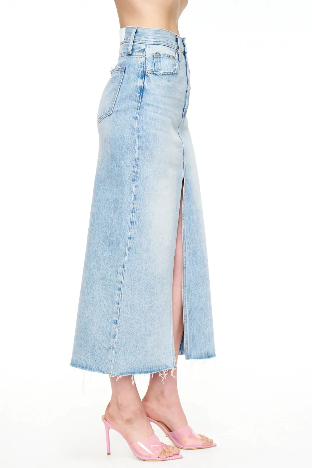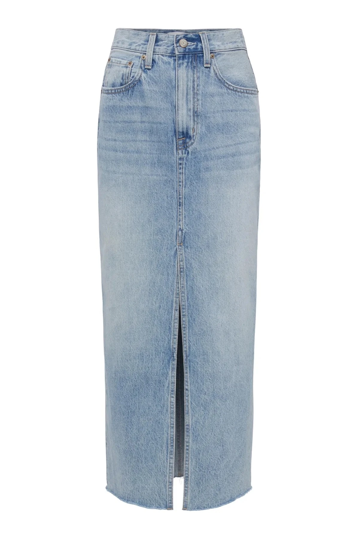 - The Alice denim midi skirt is designed with a front slit, raw hem and relaxed fit that’s designed to sit at the hips