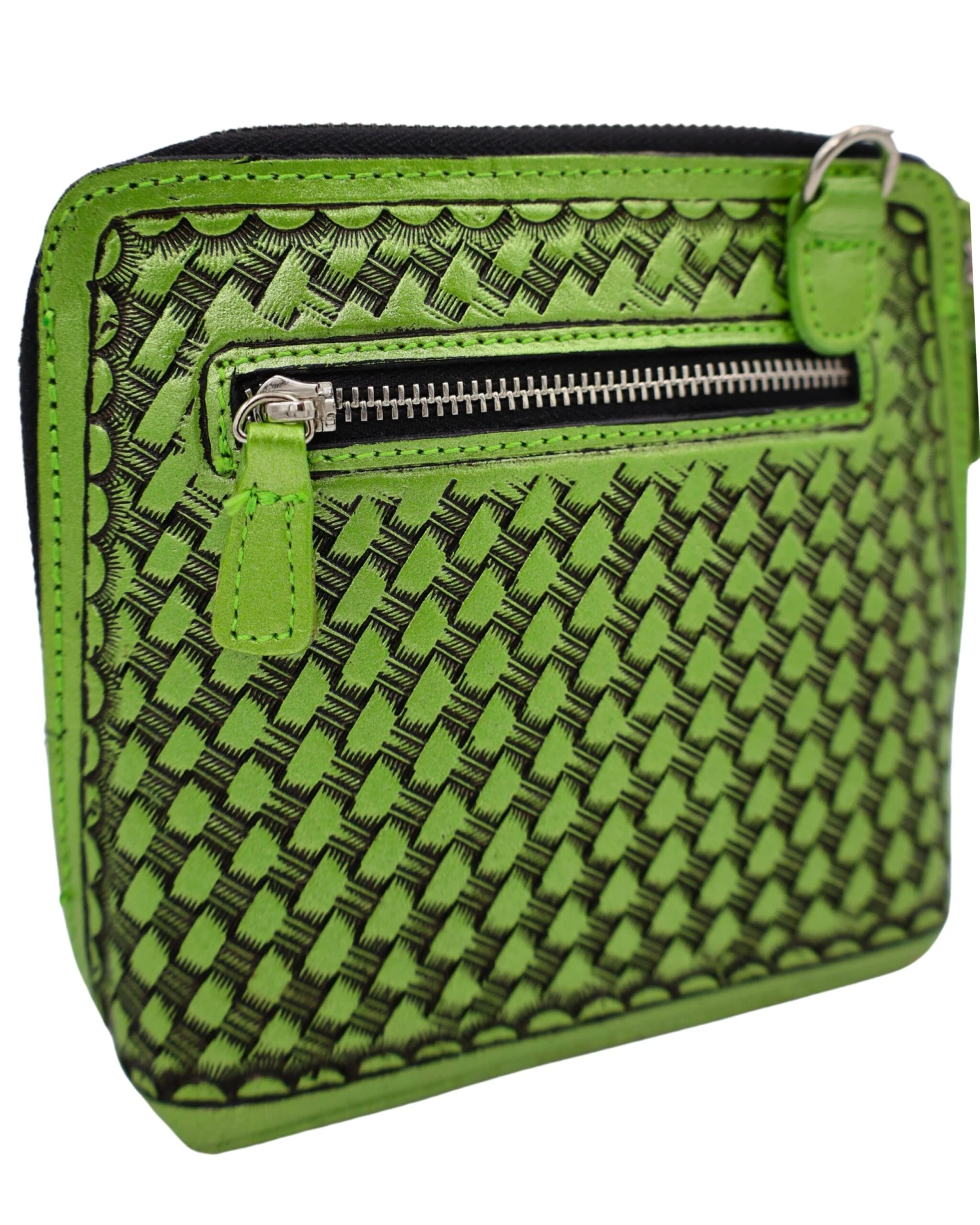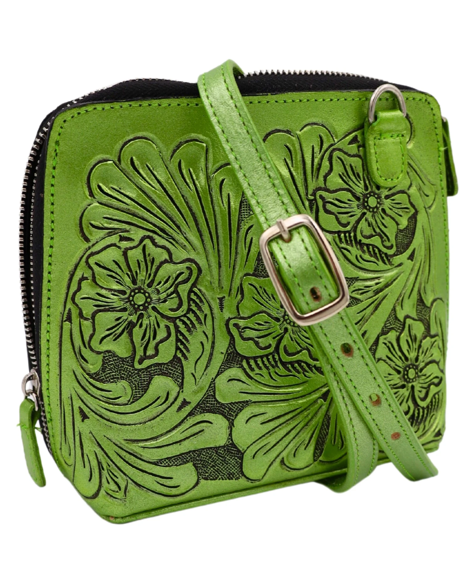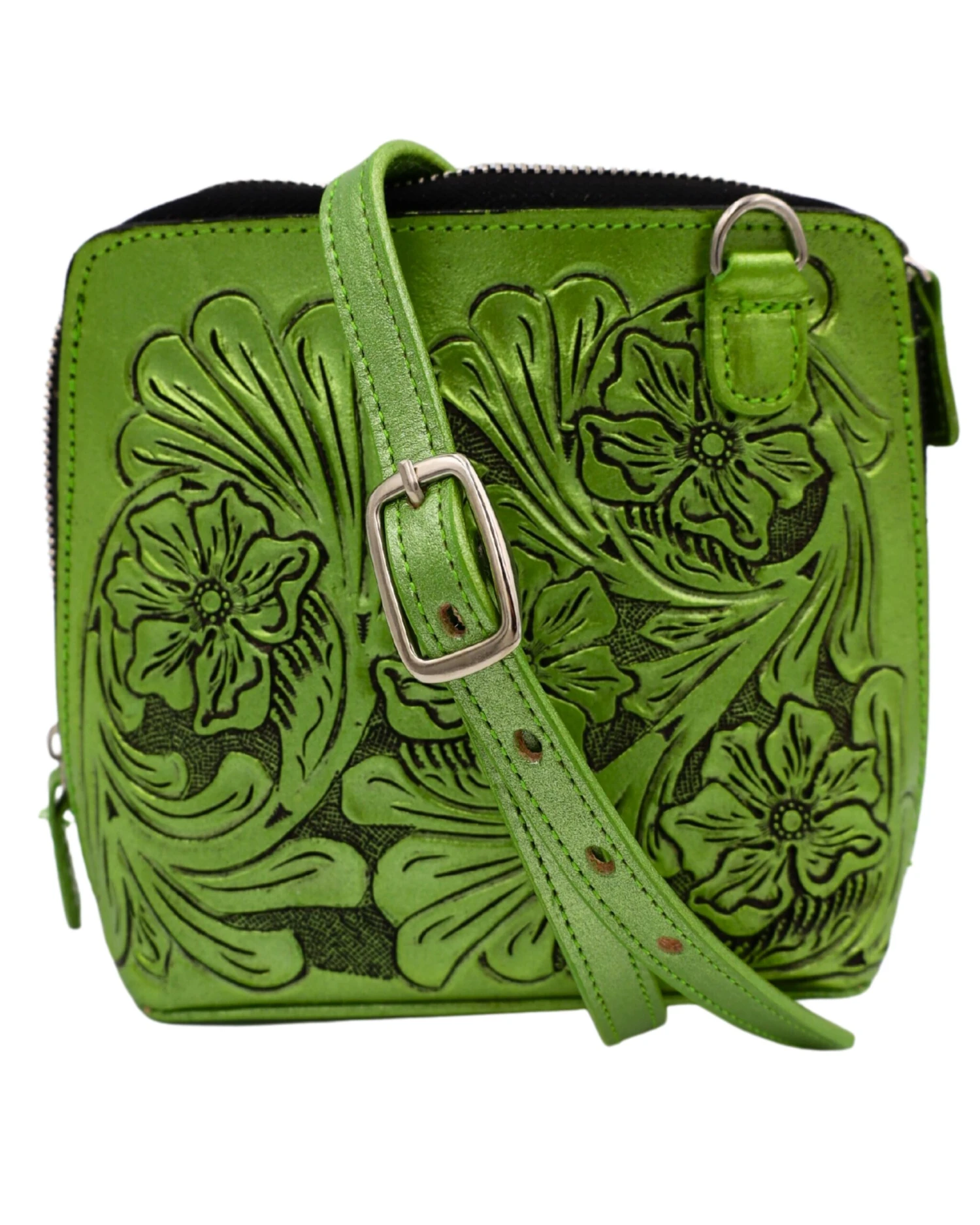 Made in Mexico, these handbags are the finest leather and tooling, in metallic green shades, since Maverick Fine Western Wear LOVES vibrant colors! Workmanship and details a joy to behold! Square with attractive tapered shape of 8.5 x 7 x 3″ bag with cute 48″ cross body strap. One side has tooled basket weave texture and the other has traditional floral motif, with zip closure. Inside secure zipped pocket.