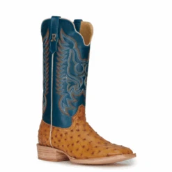 R. Watson Men’s 13″ Wide Square Toe Antique Saddle Brucciato Full Quill Ostrich with Royal Blue Cowhide Top, Double Stitched Leather Outsole with All Leather Block Heel and Full Cowhide Lining.