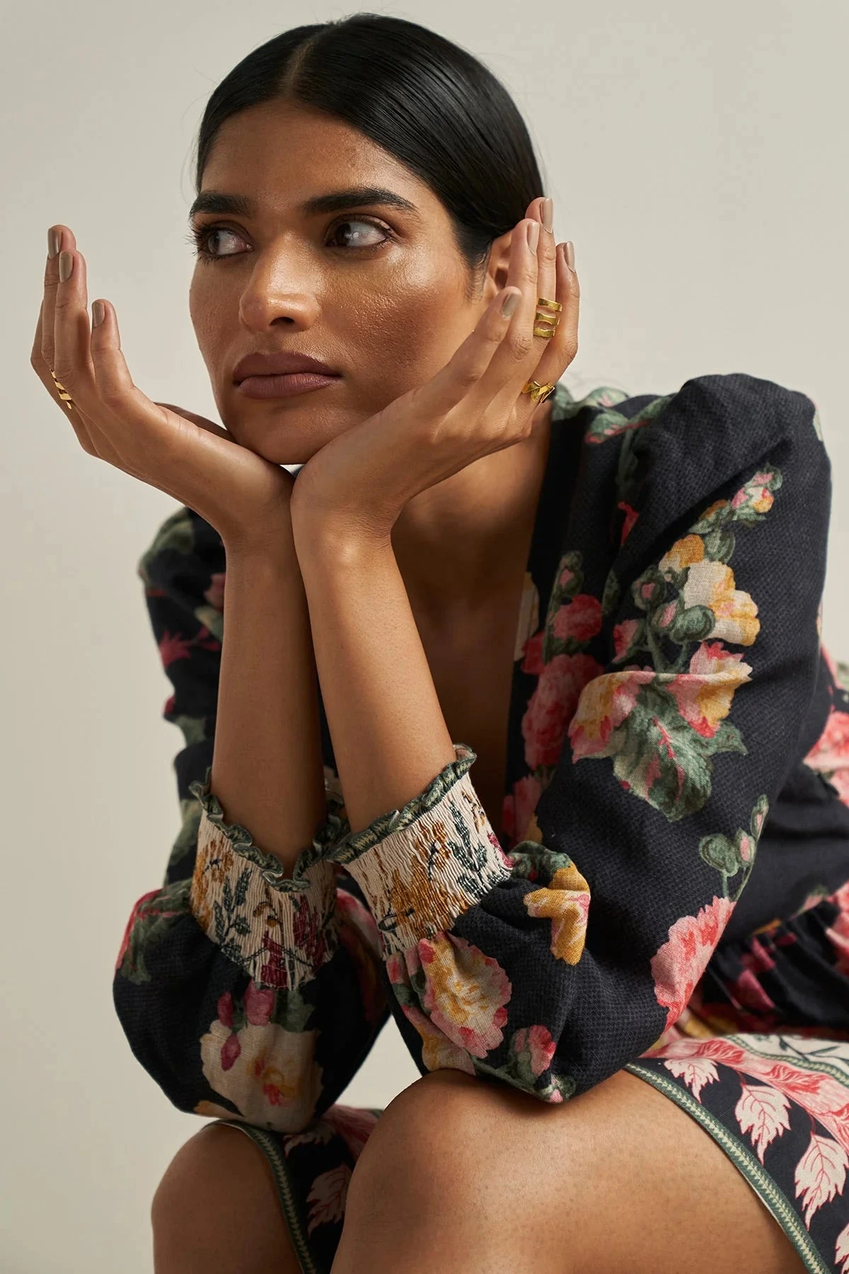 Made in linen blend, this is a dress that will take you from day to night with ease and panache. Styled with V neckline and a U shaped metallic accent, the dress flares to touch the legs just above the knees. Our signature floral print of Hollyhocks gives this dress a charming appeal. Pair it with minimal accessories to complete the ensemble.