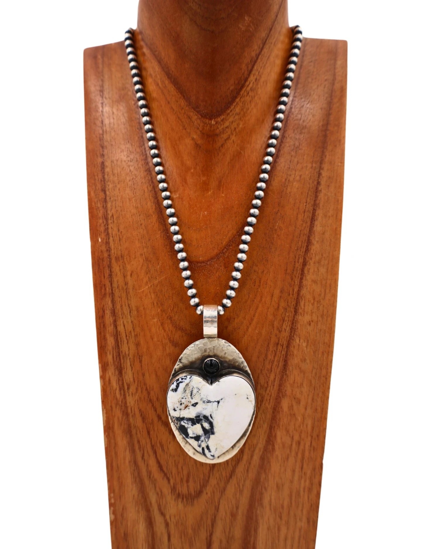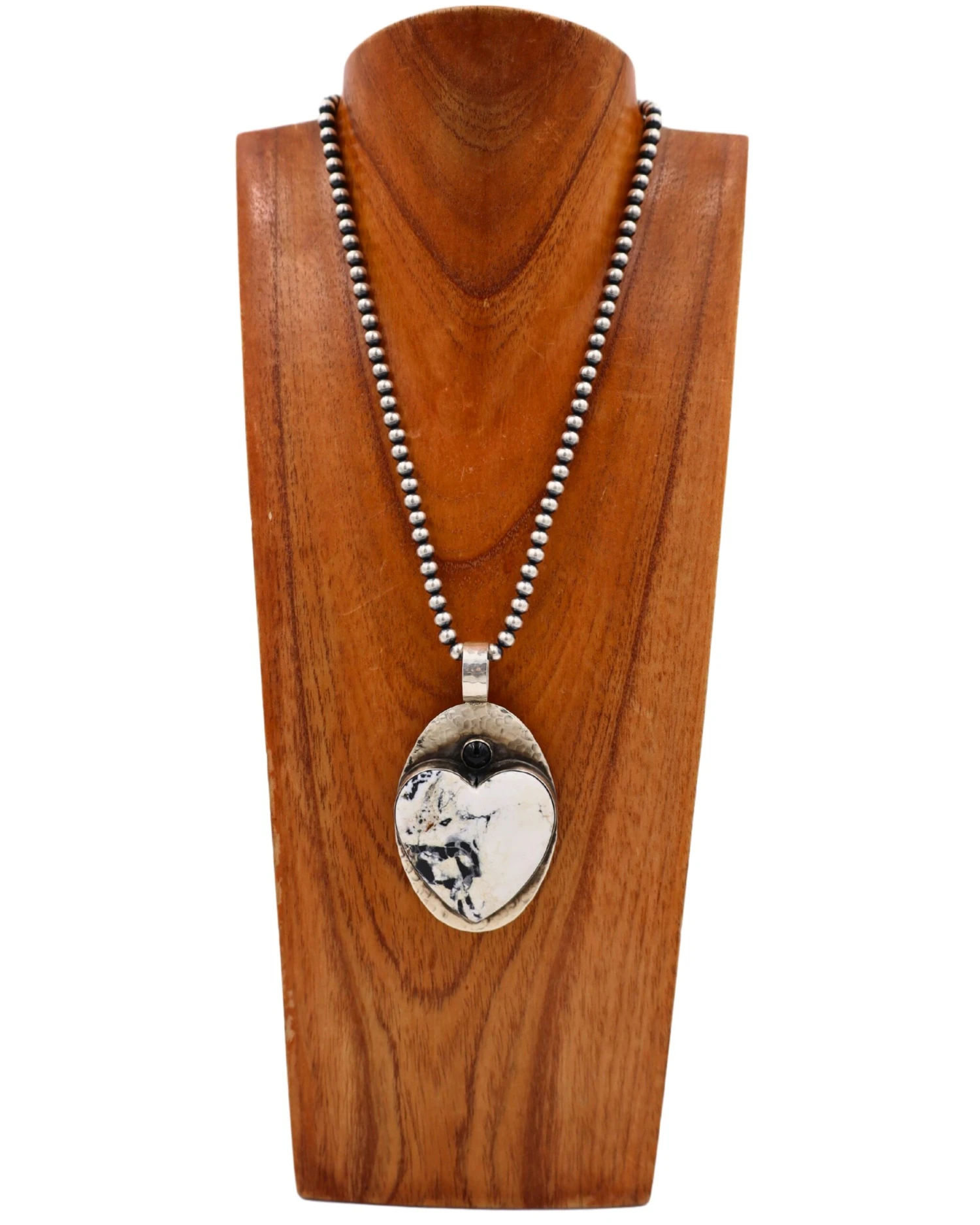 This large pendant handmade by Texas native Richard Schmidt highlights the multifaceted nature of the White Buffalo stone. Features a large slab of genuine White Buffalo plated on textured Sterling Silver with Onyx dot above it. Though simple in its design, this spectacular pendant is not understated in its beauty!