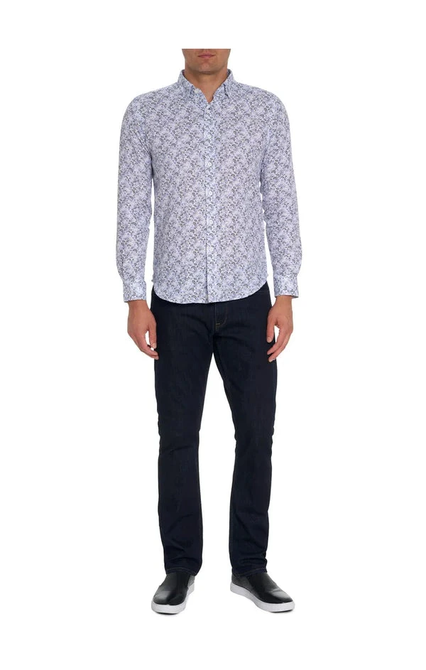 A tri-tone burn out geometric print gives dimension to this linen and cotton blend button down long sleeve shirt. Works really well with faded RG jeans.