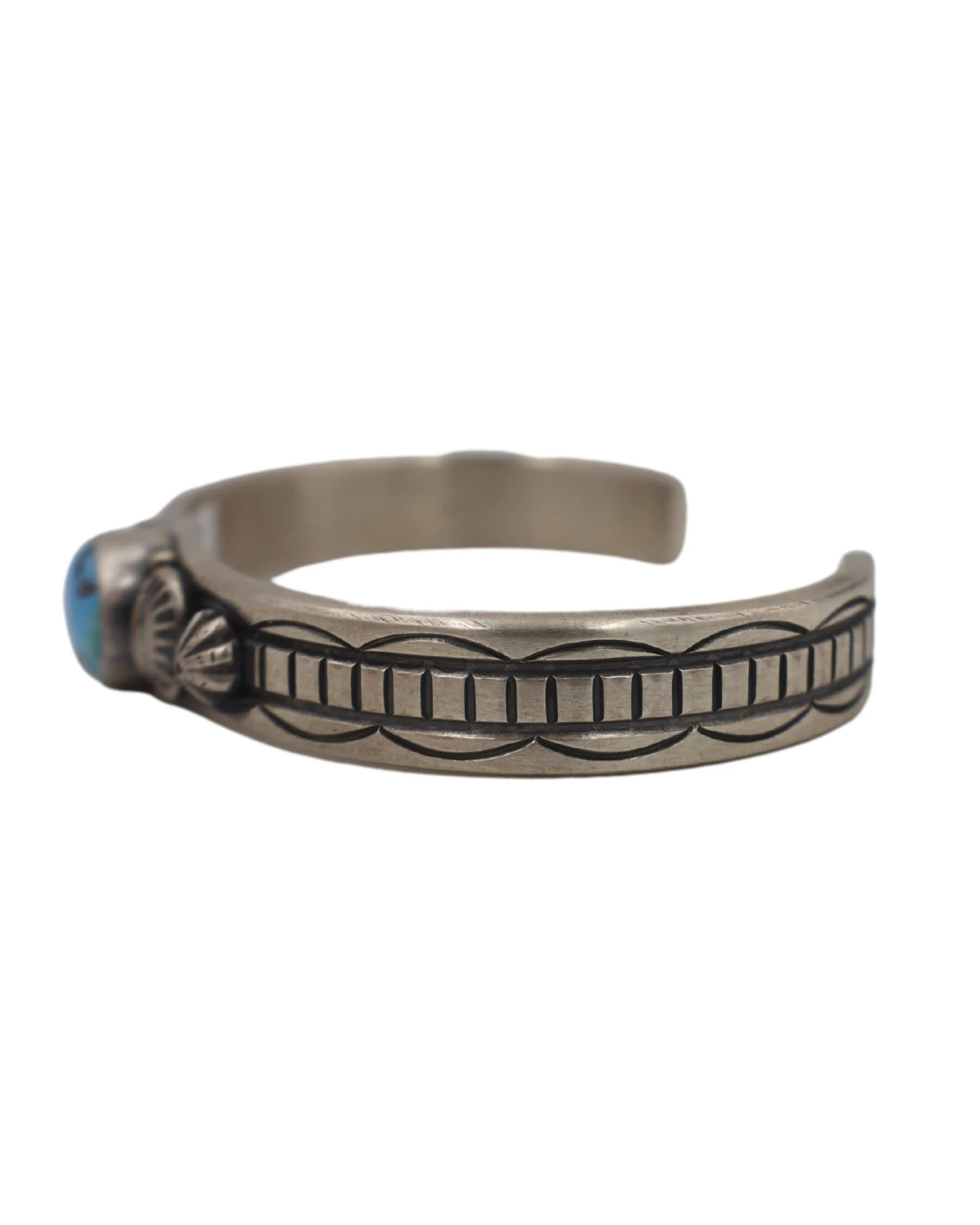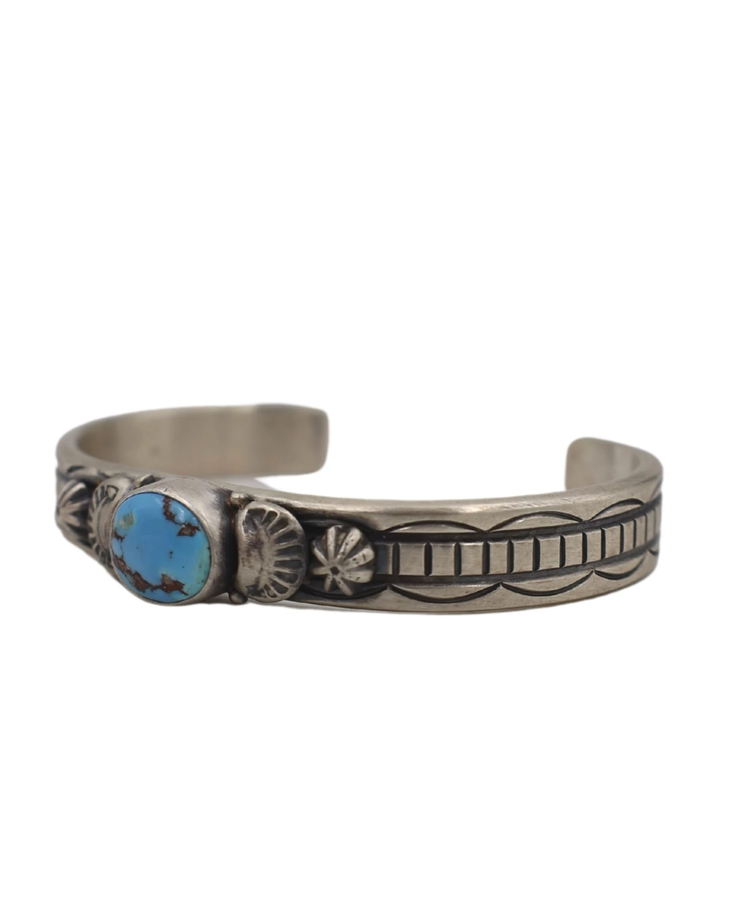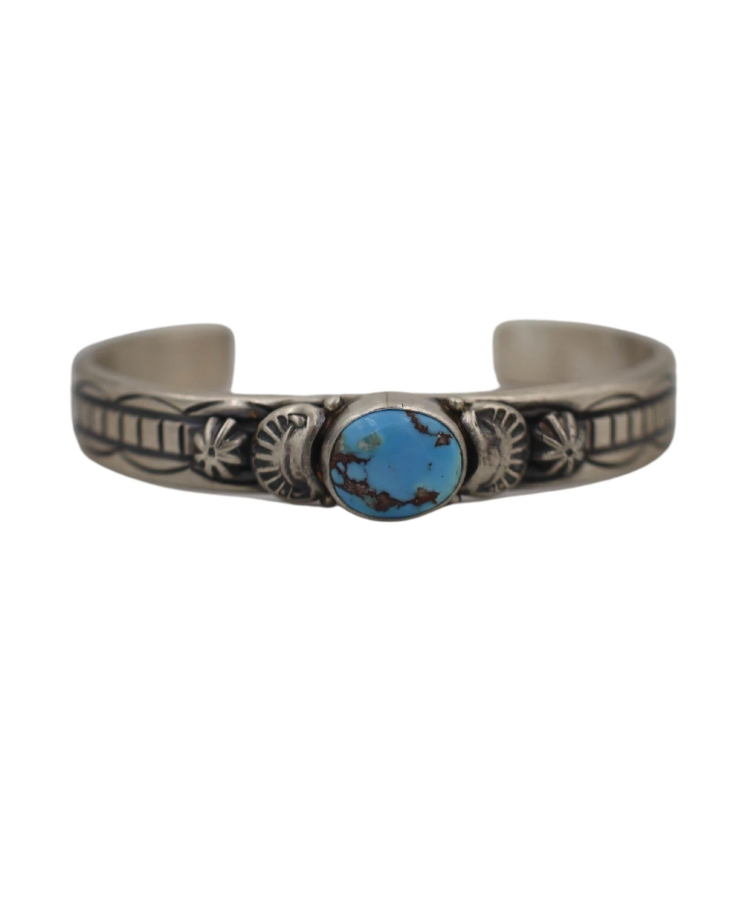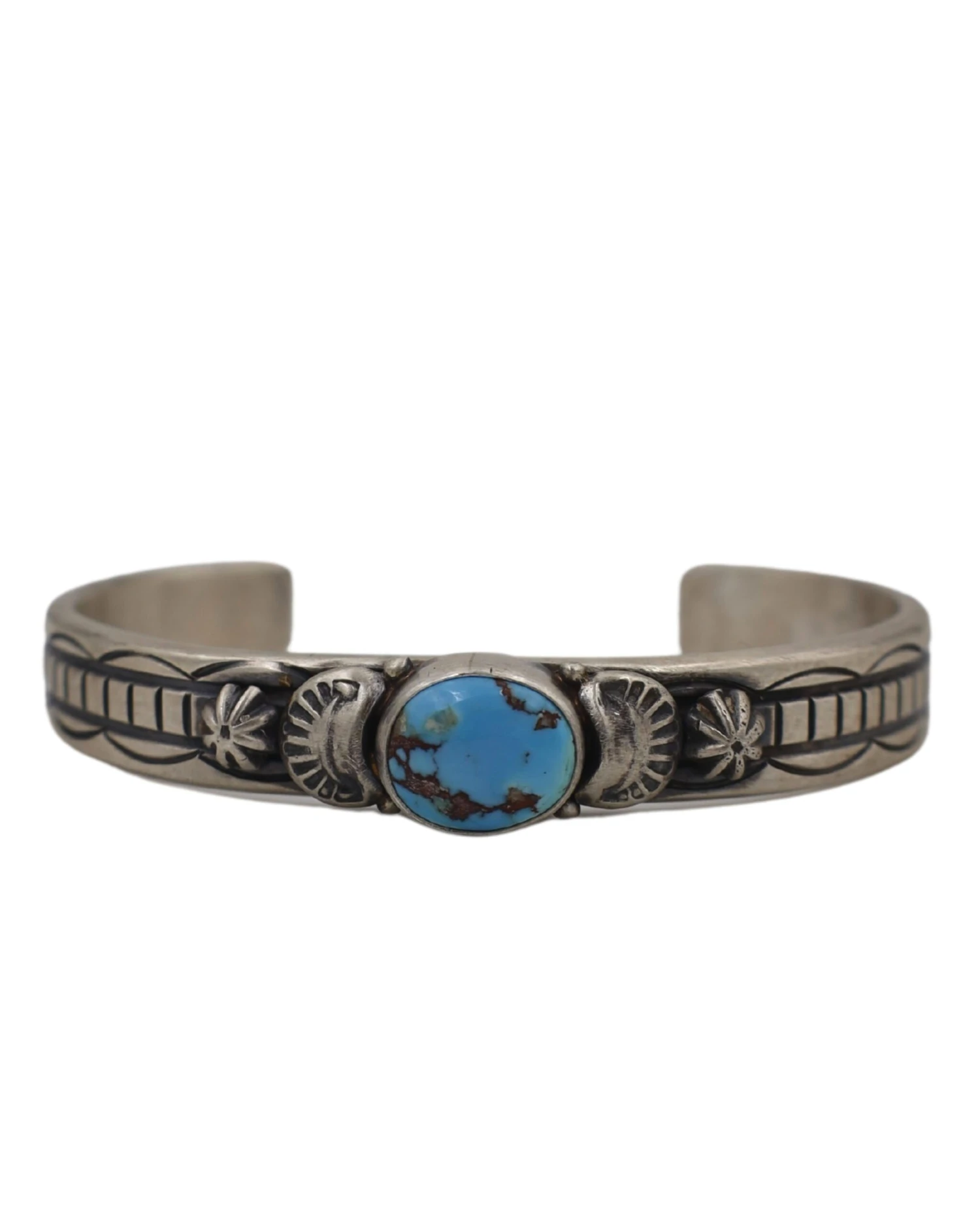 Beautifully crafted with delicate and intricate details, this Single Turquoise Oval Cuff will be the statement piece of your jewelry collection. With a turquoise center stone, surrounded by a unique sterling silver with stamped designs, this cuff will turn heads and leave a lasting impression. Ready to make a statement?
