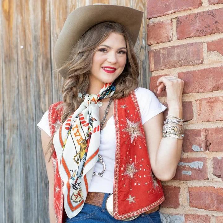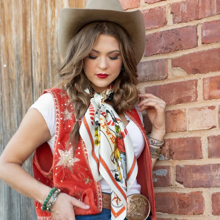 The Star Of The West is a 100% Satin Silk wild rag that has a BIG retro vibe to it! Vintage cowboy graphics with rope border and stars highlighting corners. This is a fun one and will last for years to come!