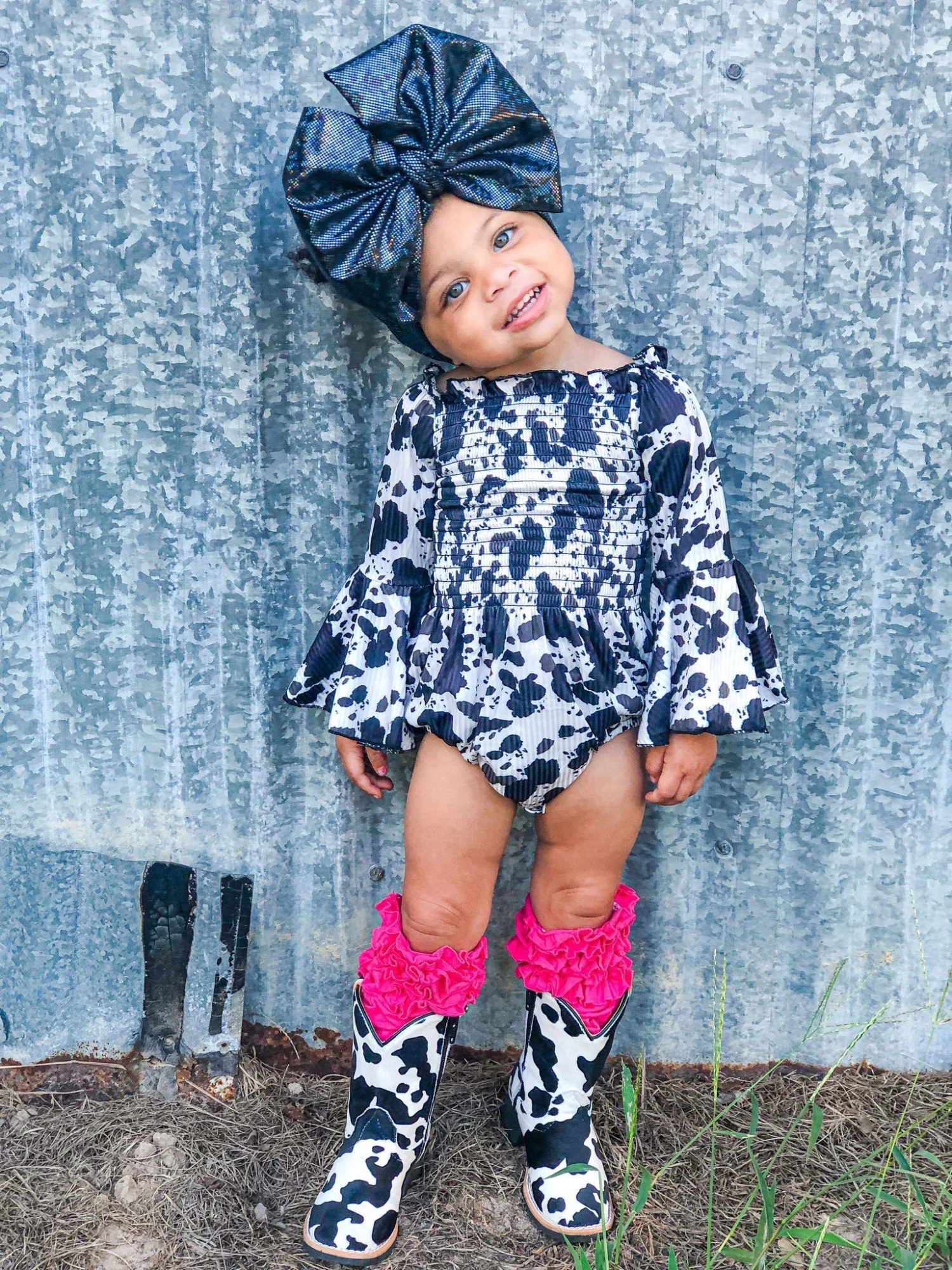 Little cowgirls will feel like the stylish new sheriff in town in these adorable cow print cowgirl boots. An elevated heel boosts this pair up for high fashion appeal, while soft plush fabric details the entirety of the fabulously feminine Western-style girl boot.