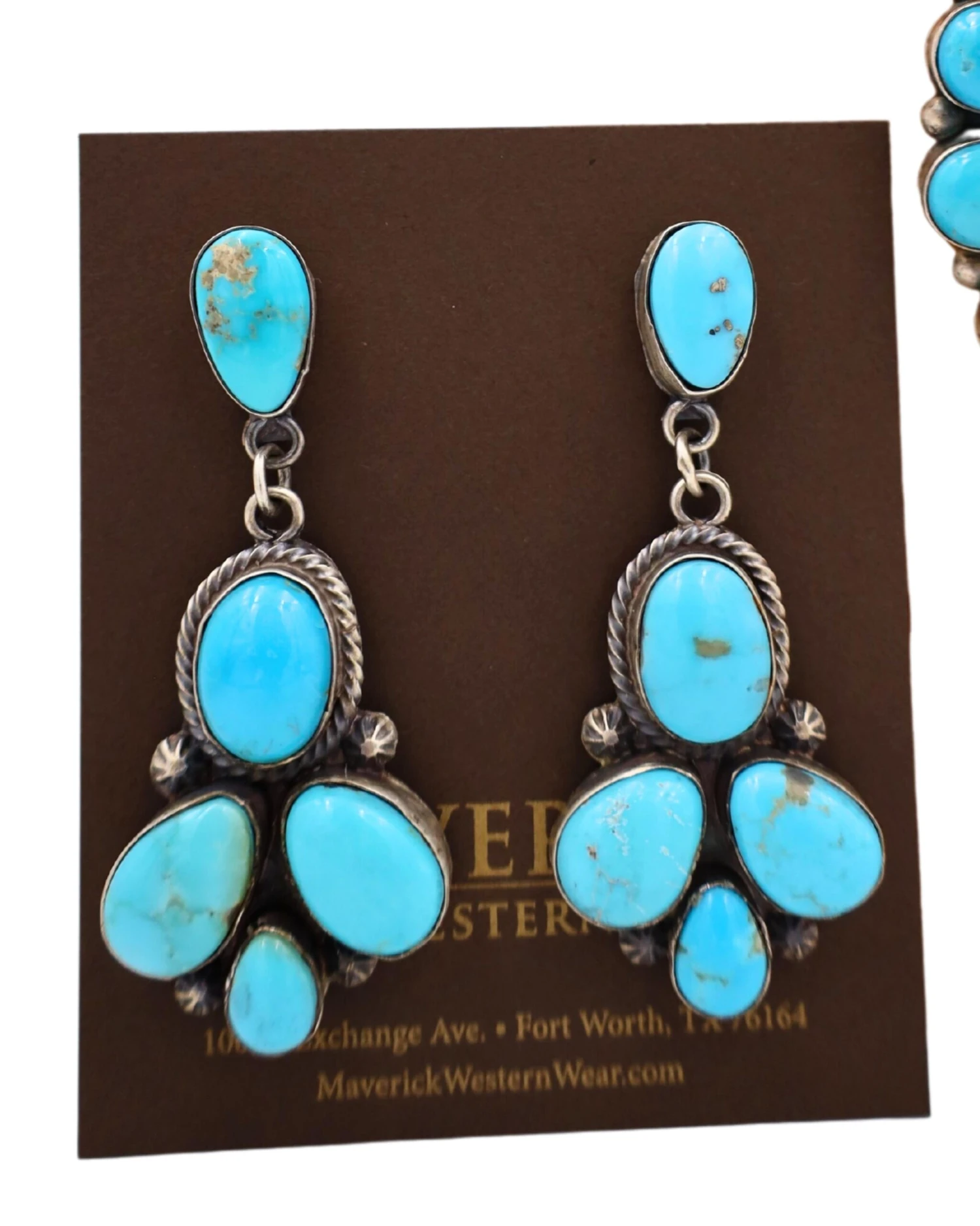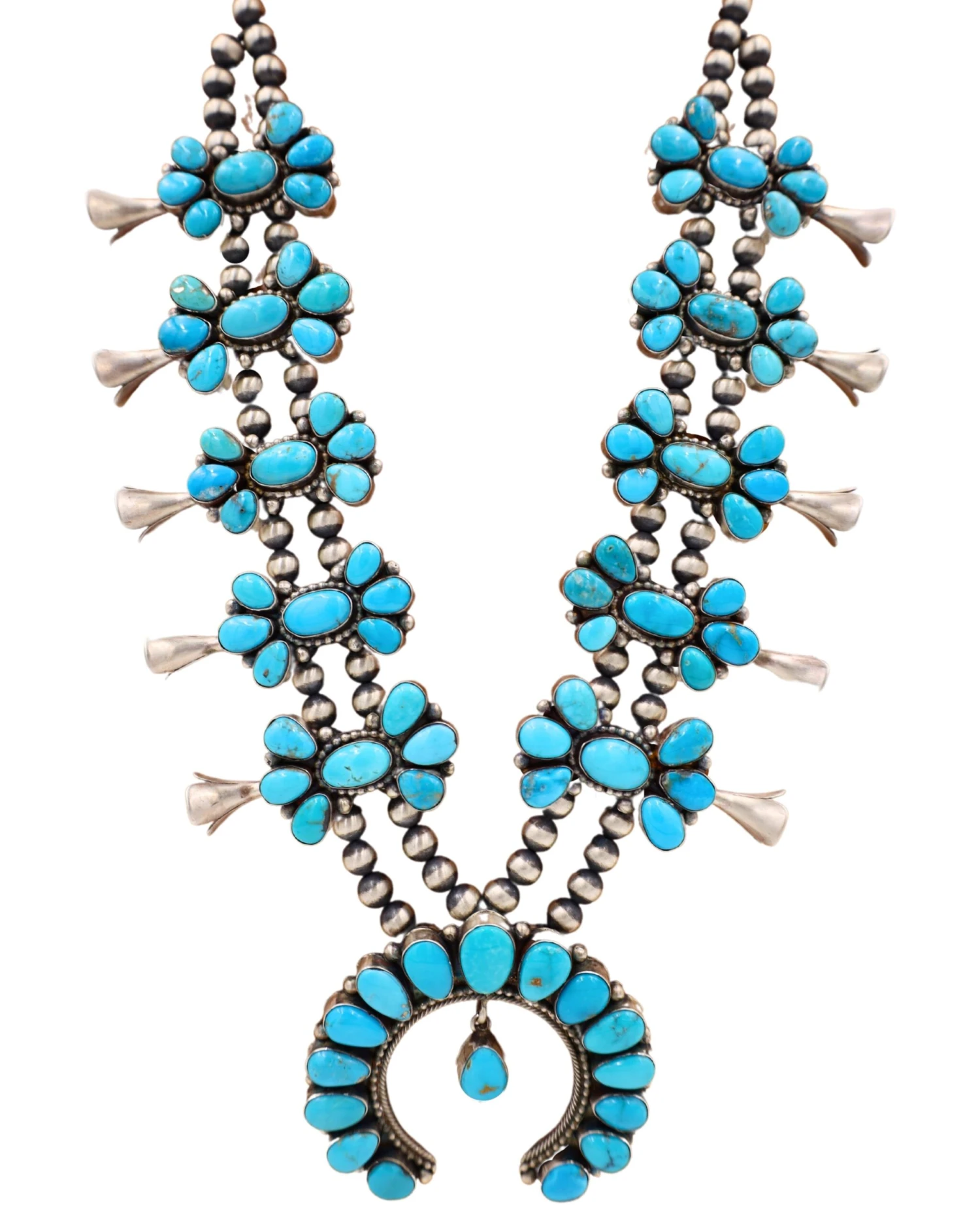 This is an exquisite necklace and earring set features stunning and finely detailed blue turquoise. The turquoise on both the earrings and necklace is uniquely arranged as to mimic a floral pattern while the center pendant is in a beautiful Naja shape and is plated on Sterling Silver. The necklace features a simple clasp closure. This set is sure to make any outfit extravagant and eye-catching, and will be a valuable addition to your fine jewelry collection.
