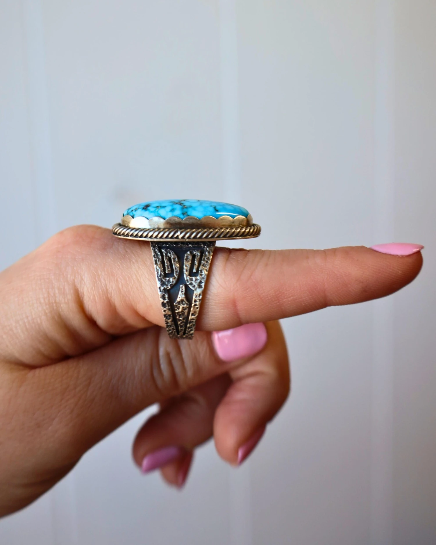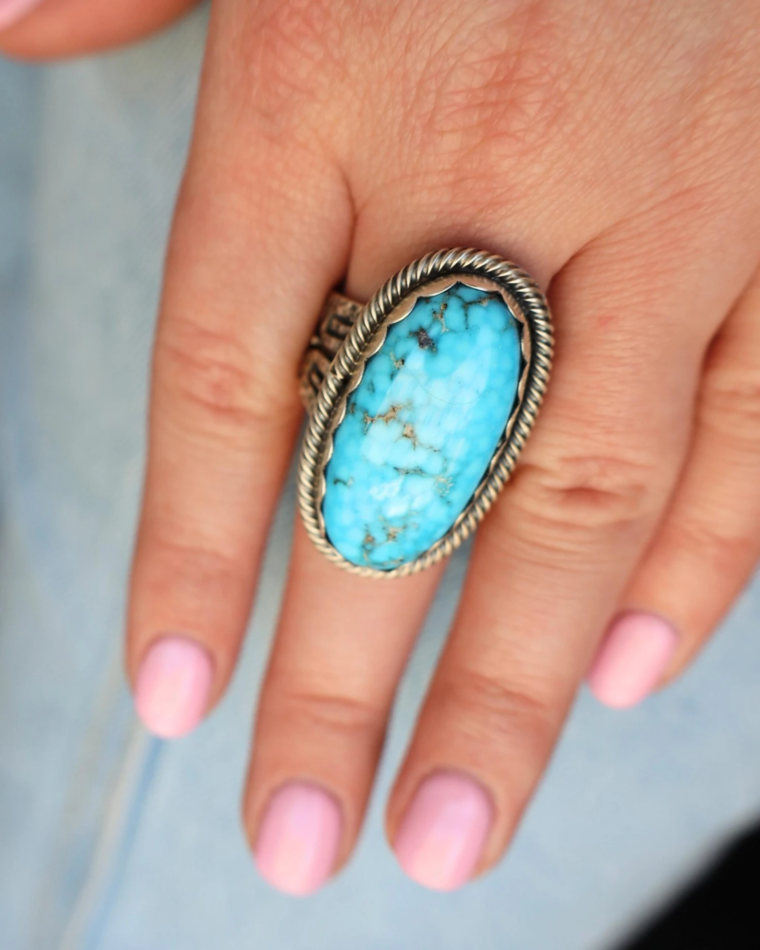 This ring features a vibrant and beautifully cut bright turquoise oval stone, set in a detailed sterling silver band. The band’s textured design adds an element of sophistication and elegance to the piece, while the roping detail around the turquoise stone showcases the craftsmanship and attention to detail that went into its creation.