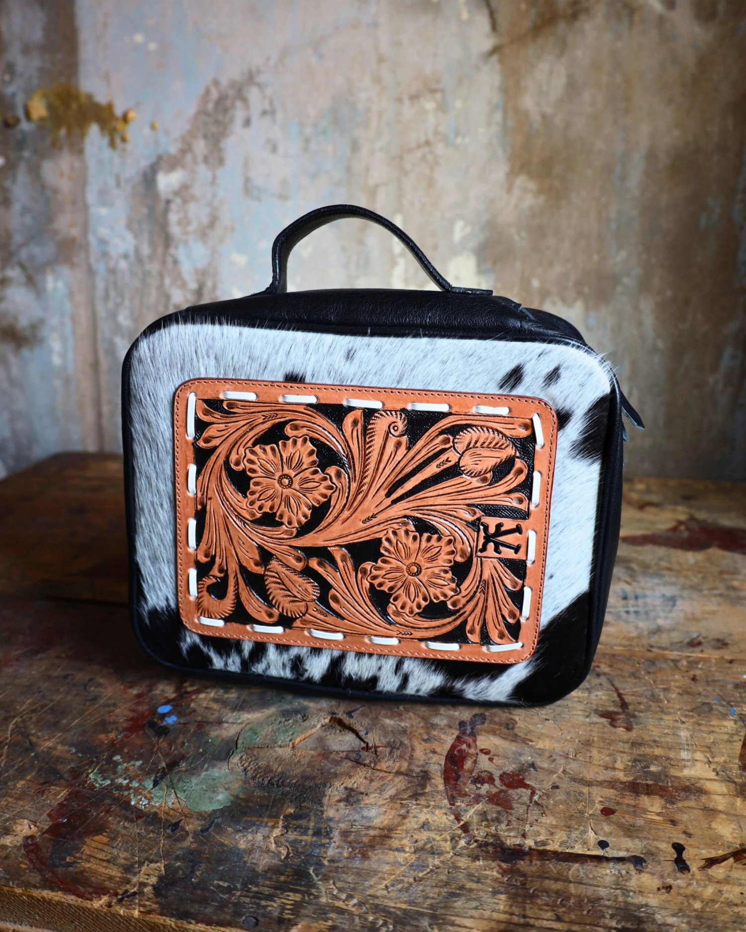 My new “jewelry book” with protective plush velvet “pages” with zippered clear plastic compartment’s. Extra leather patch with holes for more post earrings, 2 snapping rows to slide your rings, more zippered pockets and snaps for necklaces. Entire bag zips closed. Natural Hair on cowhide (pattern varies) and leather with tooled leather patch with buckstitch lacing and tooled leather handle. Measures 10”X 8”. Interior is black velvet .