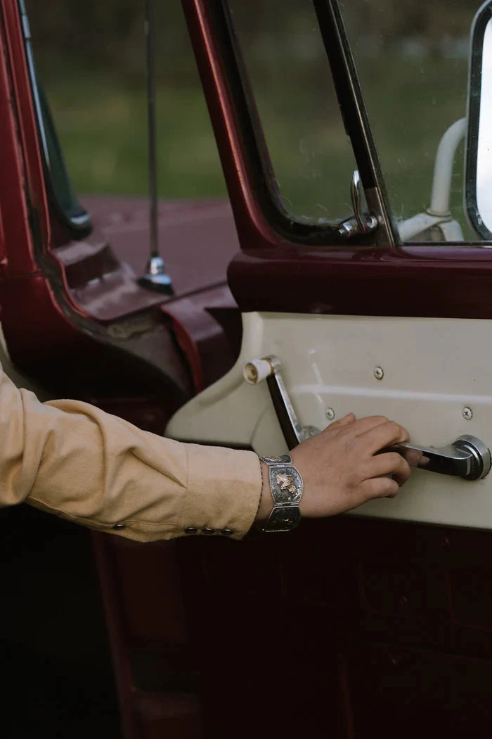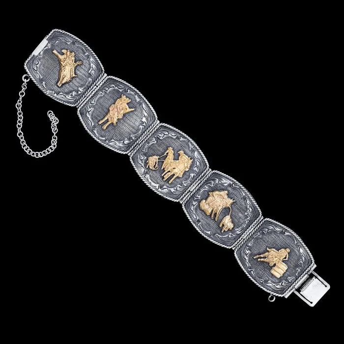 The ultimate homage to the sport of rodeo, this square-concho linked bracelet features six rodeo-ready figures in gold against an engraved, stippled antiqued background. Finished with our signature rope edge. Conchos feature a bareback rider, a bull rider, a team roper, a calf roper, and a barrel racer.